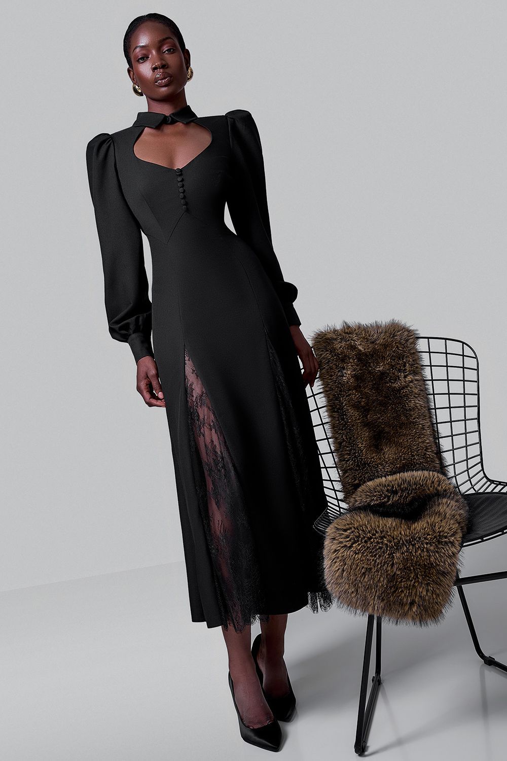 Элегантное платье миди с акцентом на женственность и утонченность. Модель выполнена из плотной ткани, идеально держащей форму, и дополнена вставками из тонкого кружева по бокам, создающими эффектный контраст. Состав: 100% полиэстер, подкладка 97% полиэстер, 3% эластан