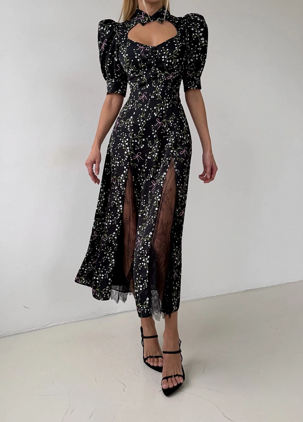 Платье миди с архитектурным лифом формирует утончённый силуэт и подчёркивает линию талии. Акцентный воротник-стойка с вырезом heart cut добавляет образу современную графичность и делает модель узнаваемой. Мягкая линия юбки раскрывается в движении, открывая кружевные вставки в разрезах - деликатный контраст плотной ткани и прозрачной фактуры. Эксклюзивный цветочный принт усиливает ощущение лёгкости и делает модель универсальной для дневных и вечерних образов. Идеальный баланс женственности и структурности в эстетике современного luxury.