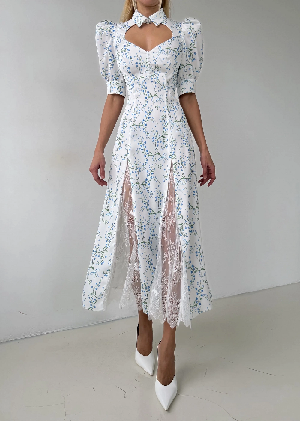 Платье миди с архитектурным лифом формирует утончённый силуэт и подчёркивает линию талии. Акцентный воротник-стойка с вырезом heart cut добавляет образу современную графичность и делает модель узнаваемой. Мягкая линия юбки раскрывается в движении, открывая кружевные вставки в разрезах - деликатный контраст плотной ткани и прозрачной фактуры. Эксклюзивный цветочный принт усиливает ощущение лёгкости и делает модель универсальной для дневных и вечерних образов. Идеальный баланс женственности и структурности в эстетике современного luxury.