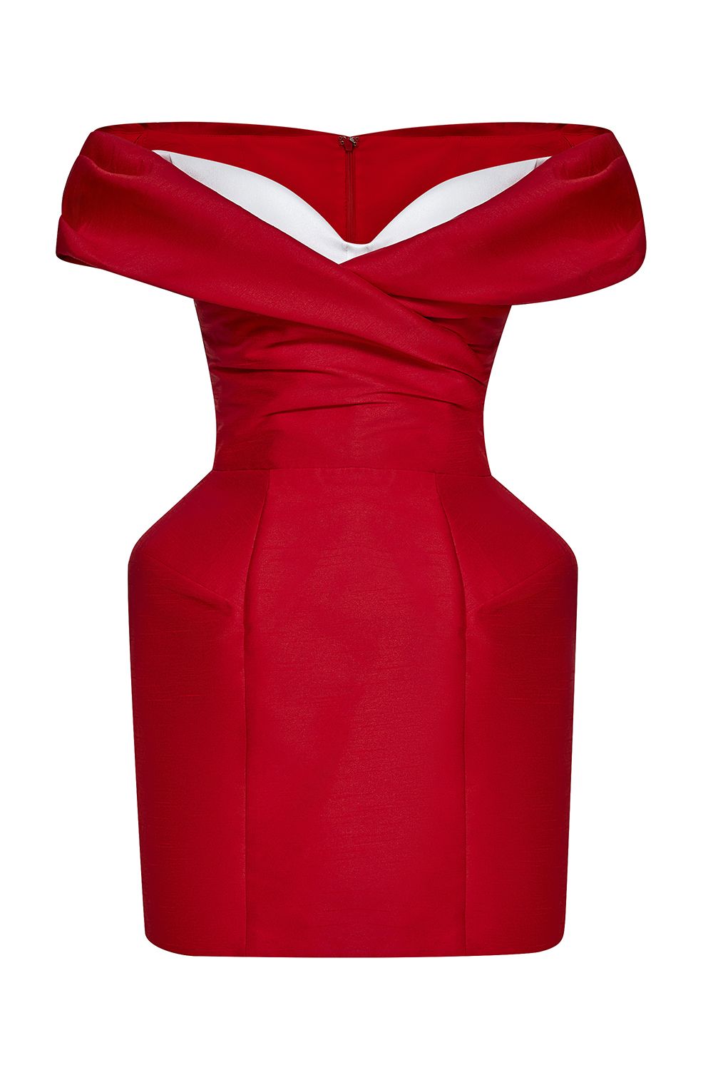 Эффектное мини-платье, созданное для особых выходов. Модель подчеркивает линию плеч и декольте за счёт мягко спущенного, драпированного верха, который открывает бюстье контрастного белого цвета - чистый акцент, добавляющий образу архитектурности и смелости. Силуэт приталенный, с акцентированной линией талии и объемной юбкой-тюльпаном, формирующей скульптурный контур.