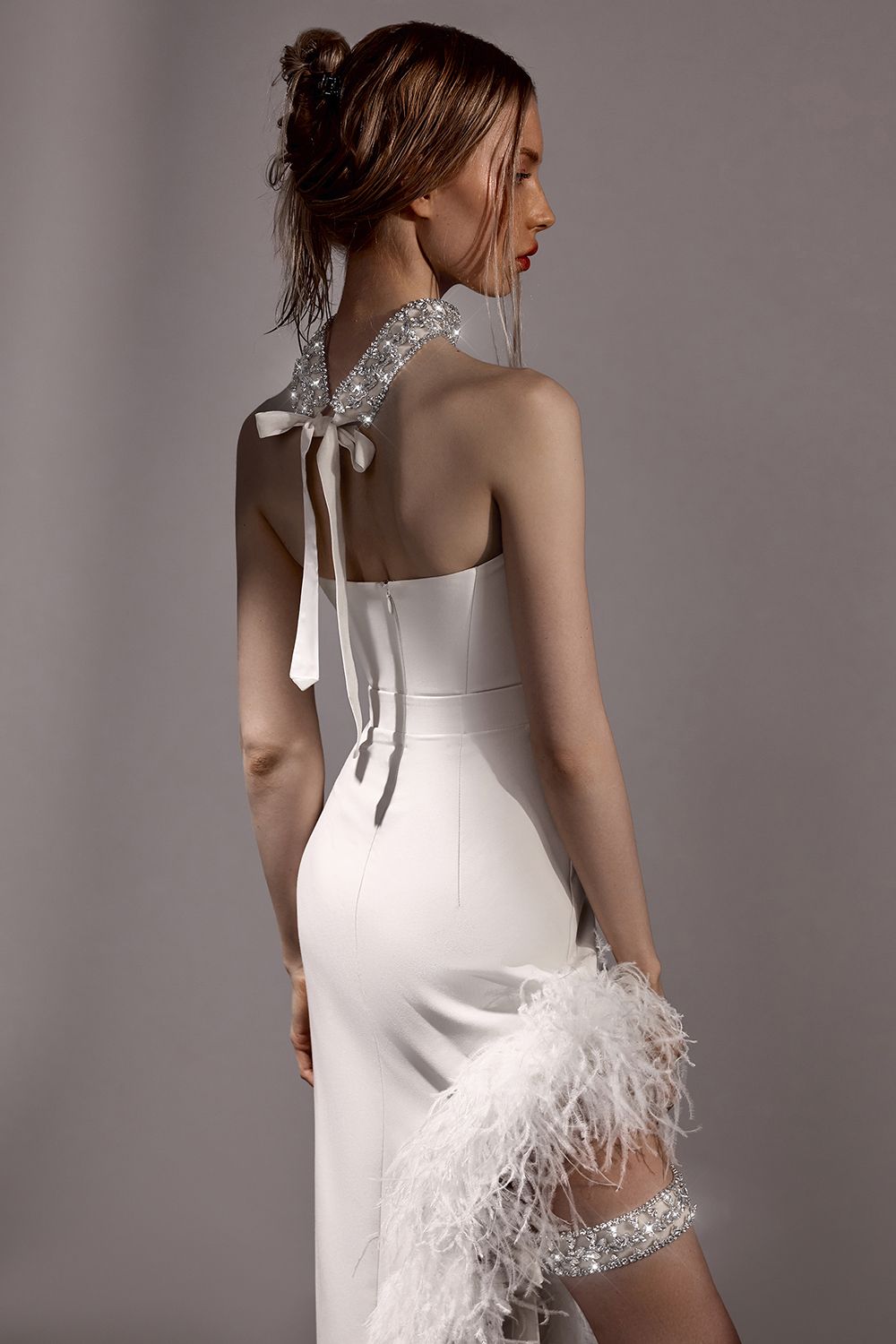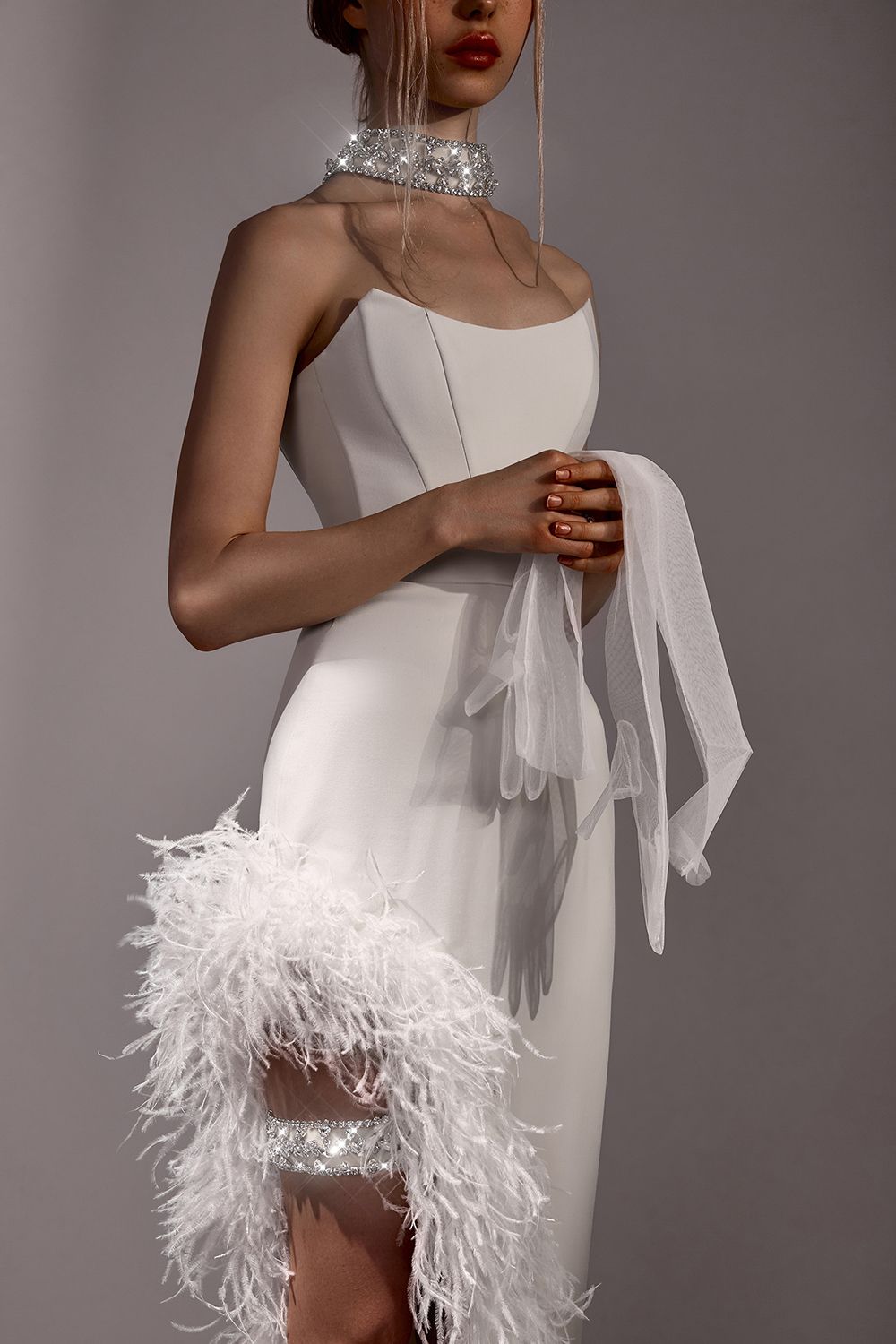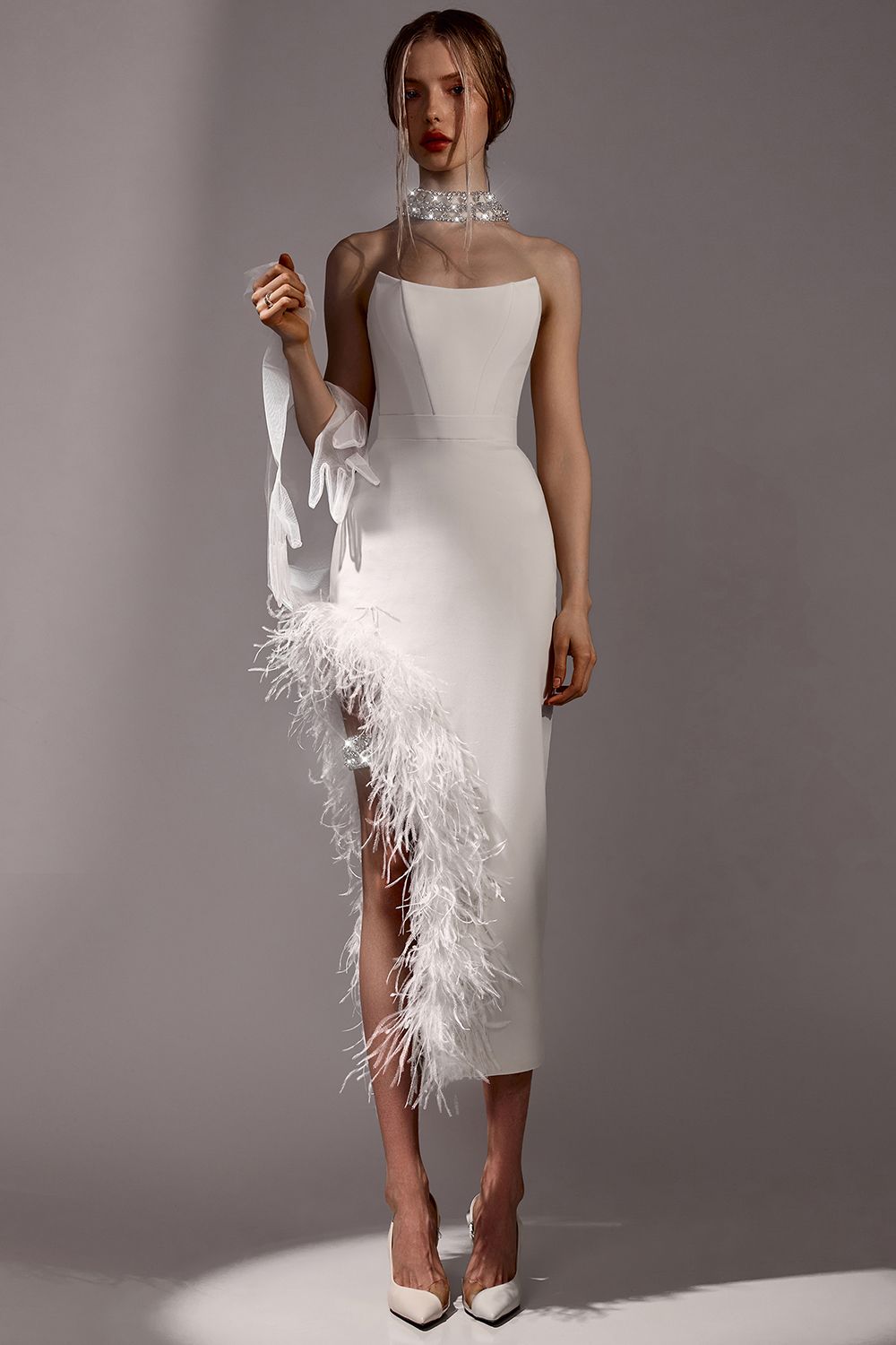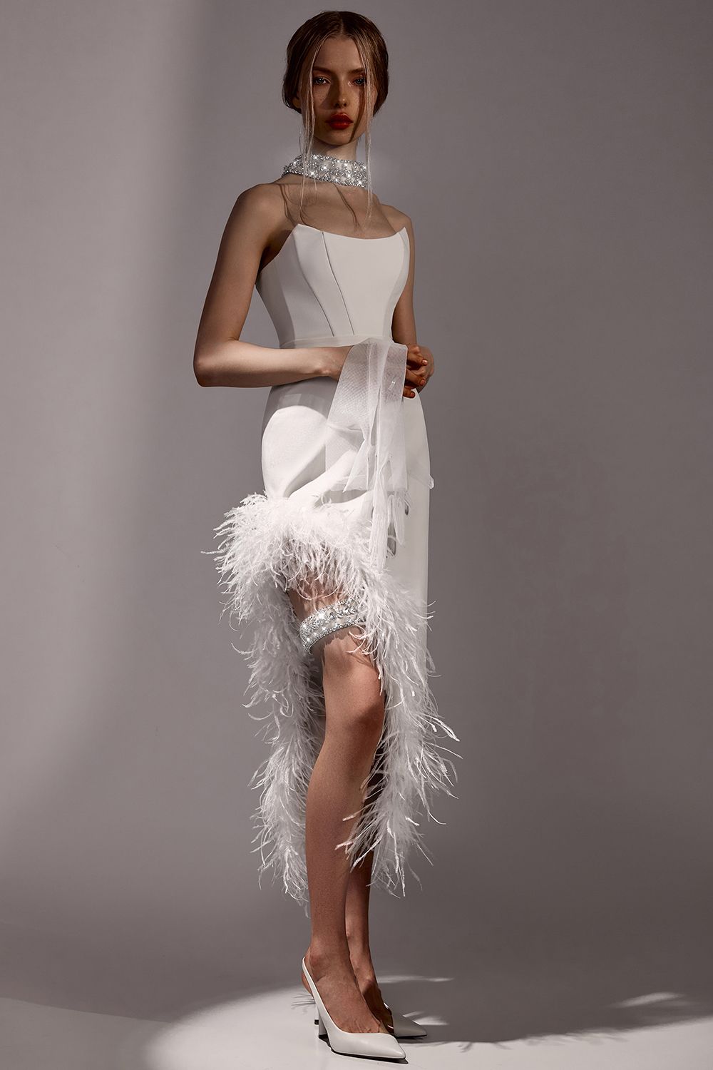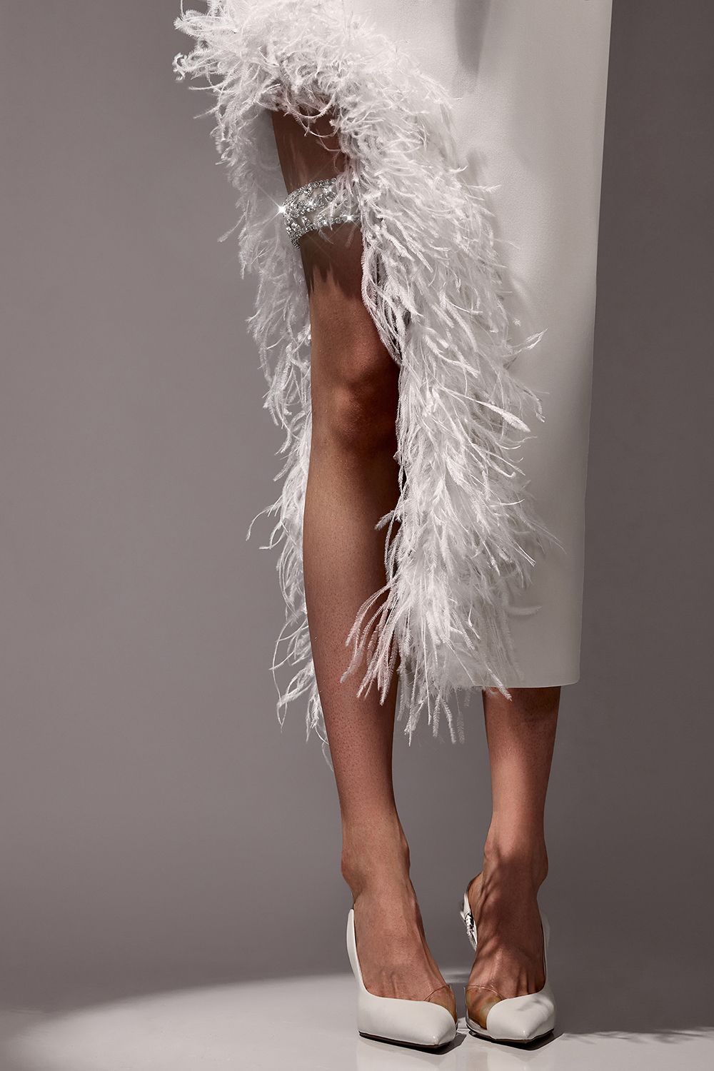 Платье-бюстье миди создаёт выразительный вечерний силуэт благодаря корсетной линии и открытой зоне декольте. Приталенный крой подчёркивает фигуру. Асимметричный разрез украшен эффектной отделкой из натуральных перьев страуса, которая добавляет динамику и лёгкость каждому шагу. Модель идеально подходит для вечерних мероприятий, коктейлей и особых случаев. Состав: 78% полиэстер, 16% вискоза, 6% спандекс; подкладка 95% полиэстер, 5% эластан