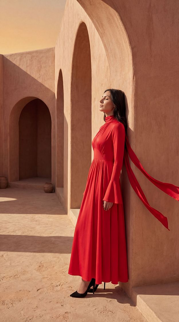 Элегантное платье миди с мягкой драпировкой, которое красиво подчёркивает фигуру и раскрывается в движении. Высокий ворот акцентирует линию шеи, придавая образу сдержанную чувственность и утончённость. Приталенный силуэт плавно переходит в расклёшенную юбку со складками, создавая лёгкость и динамику при каждом шаге. Расширенные манжеты добавляют образу выразительность и делают силуэт более графичным. Платье идеально подходит для вечерних выходов и особых случаев, сочетая в себе современную элегантность и женственность. Корсет, который продаётся отдельно, легко интегрируется в гардероб и работает как самостоятельный акцент в образе. Состав: 92% полиэстер, 8% спандекс