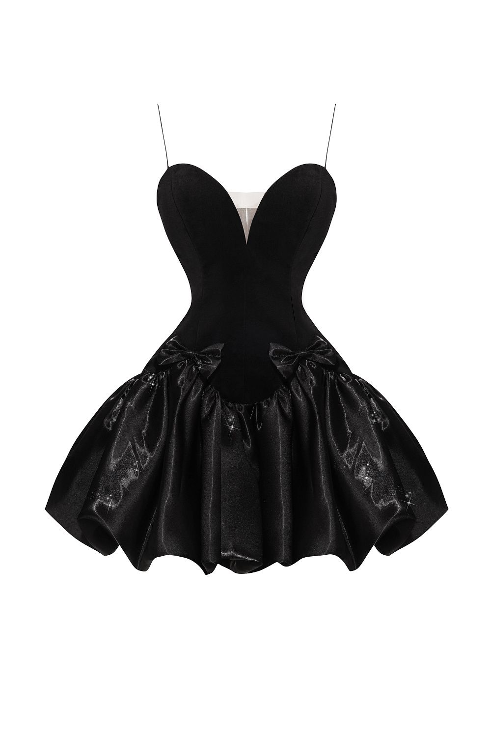 Коктейльное платье, выполненное из плотной ткани с глянцевым блеском. Верхняя часть платья имеет глубокий сердцевидный вырез на тонких бретелях, что подчеркивает зону декольте и добавляет элегантности. Юбка выполнена в формате пышного мини, с множеством сборок, создающих эффект объема и драпировки. Акцент сделан на двух декоративных бантах, расположенных на уровне талии. Состав: 100% хлопок, подкладка 95% полиэстер, 5% эластан