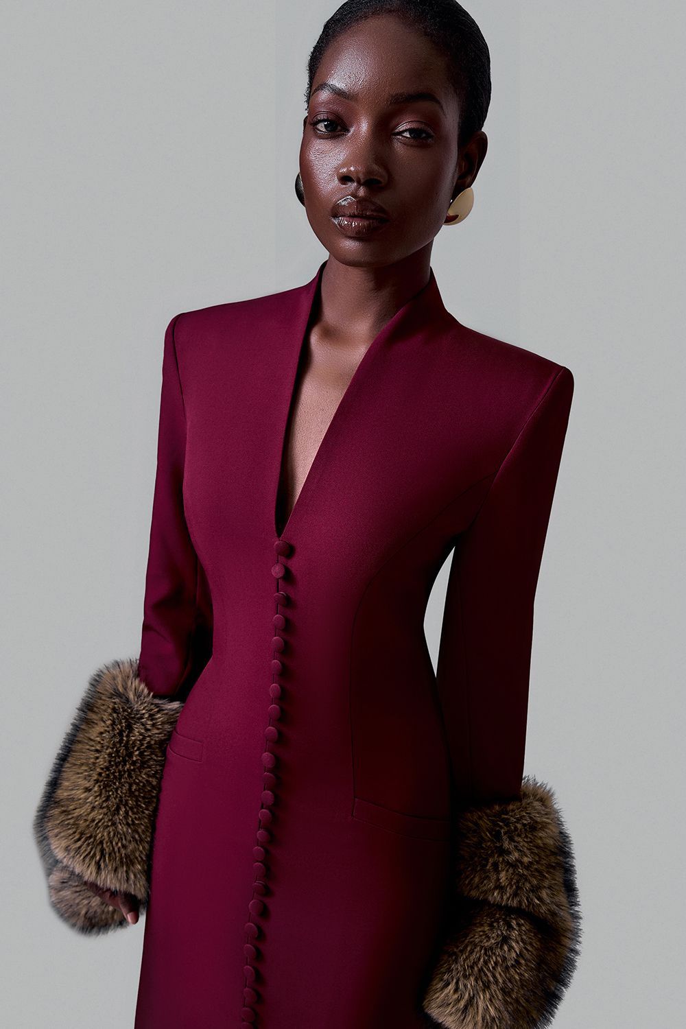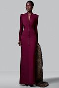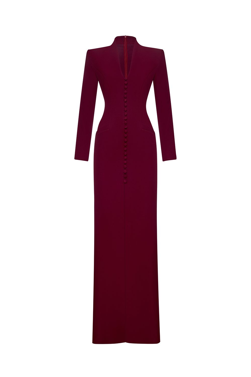 Элегантное платье длины миди. Строгий приталенный крой и вертикальный ряд обтянутых пуговиц визуально вытягивают фигуру, подчеркивая её изящество. Высокий фигурный воротник добавляет образу архитектурной чёткости, а длинные рукава усиливают эффект лаконичности. Длина платья по спинке с учетом стойки: 149 см. Состав: 97% полиэстер, 3% спандекс, подкладка 95% полиэстер, 5% эластан