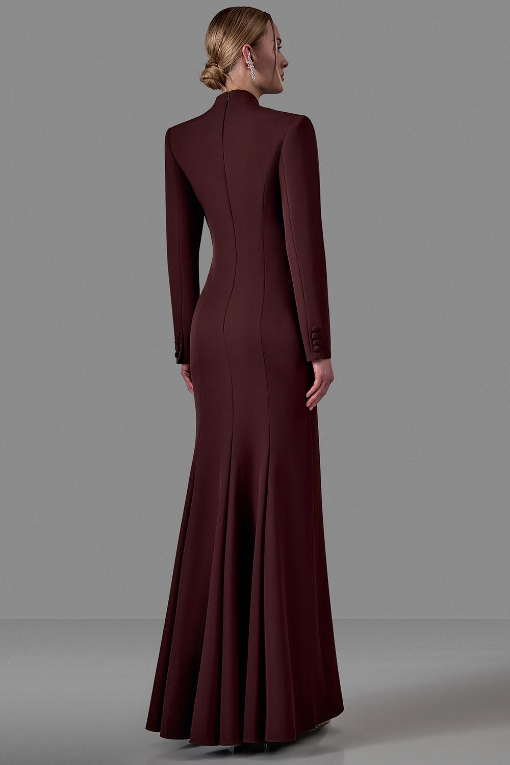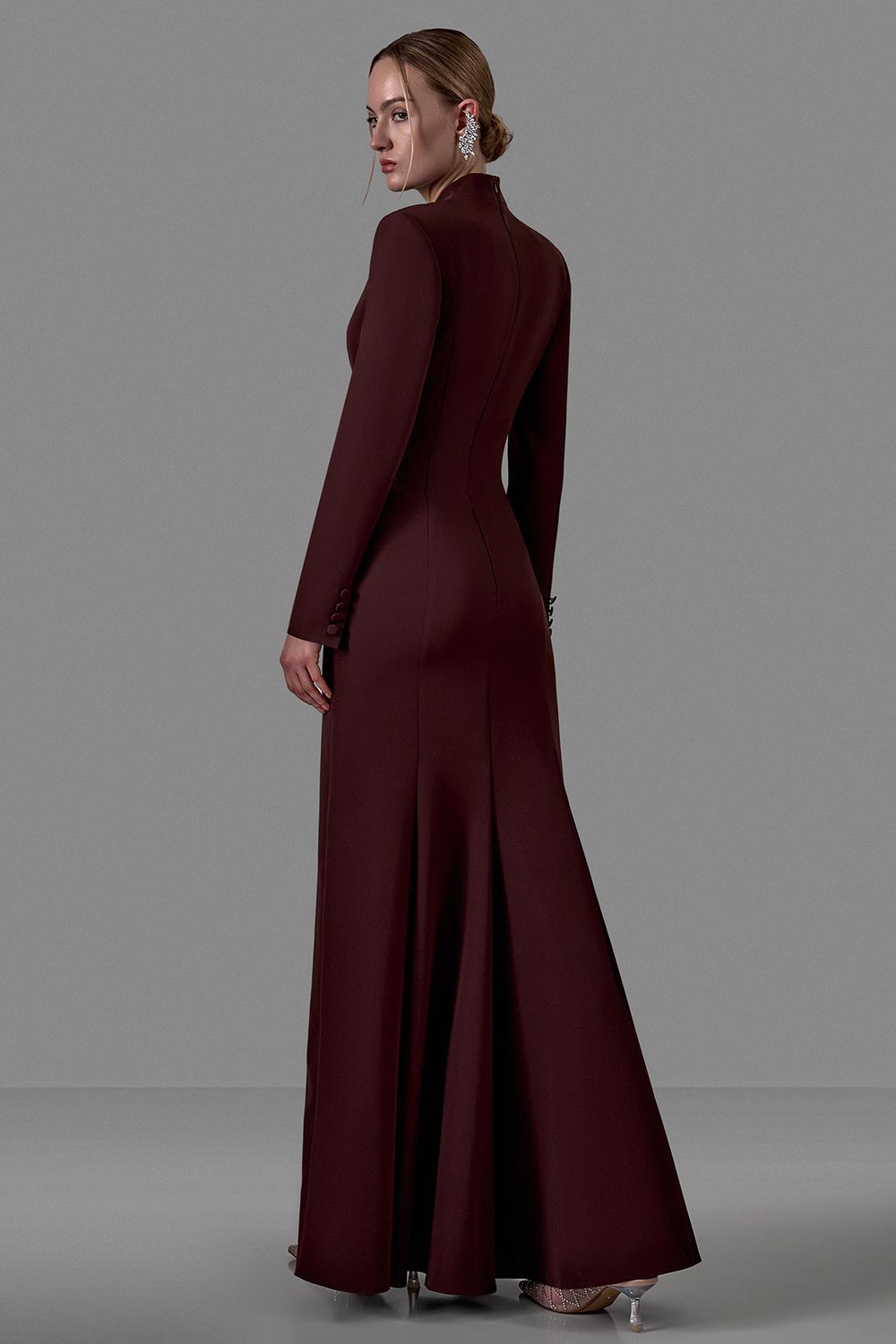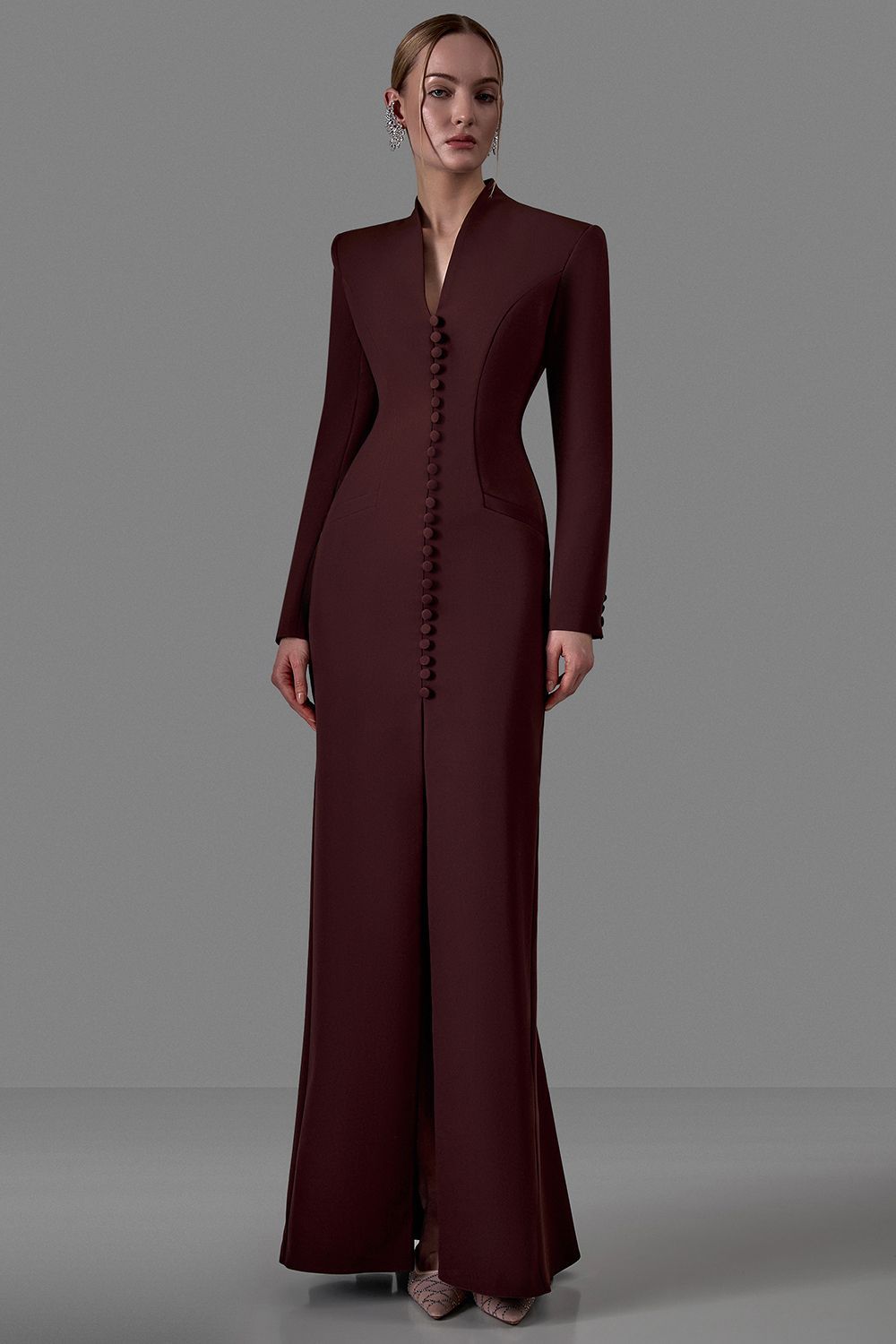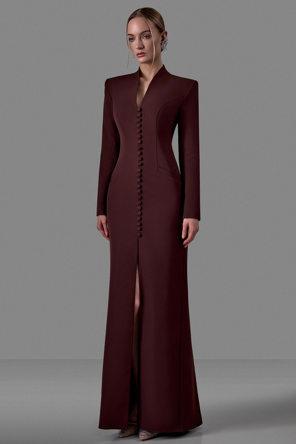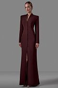 Элегантное платье длины миди. Строгий приталенный крой и вертикальный ряд обтянутых пуговиц визуально вытягивают фигуру, подчеркивая её изящество. Высокий фигурный воротник добавляет образу архитектурной чёткости, а длинные рукава усиливают эффект лаконичности. Длина платья по спинке с учетом стойки: 149 см. Состав: 97% полиэстер, 3% спандекс, подкладка 95% полиэстер, 5% эластан