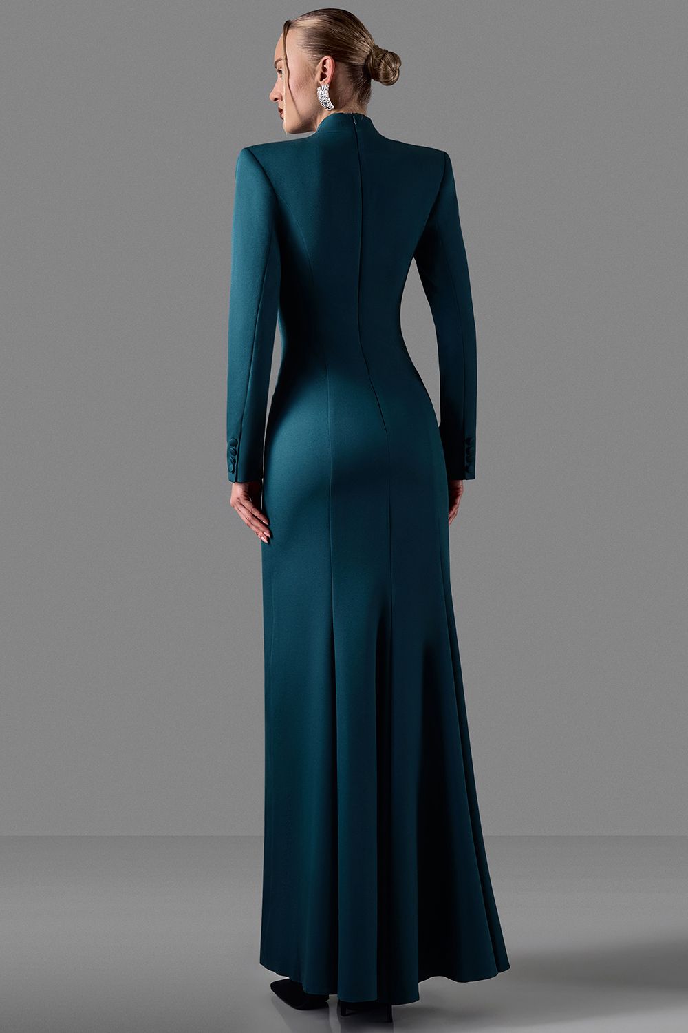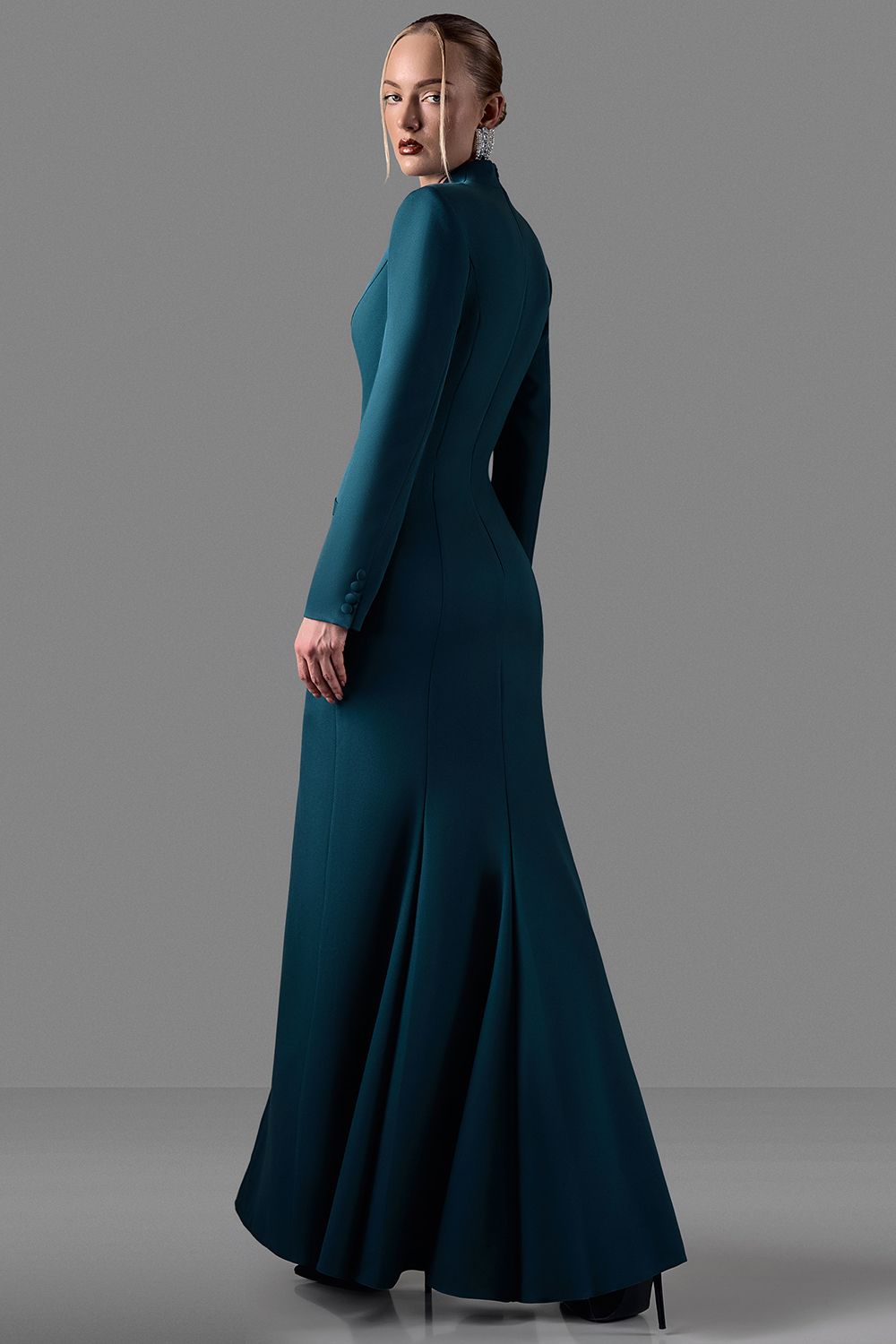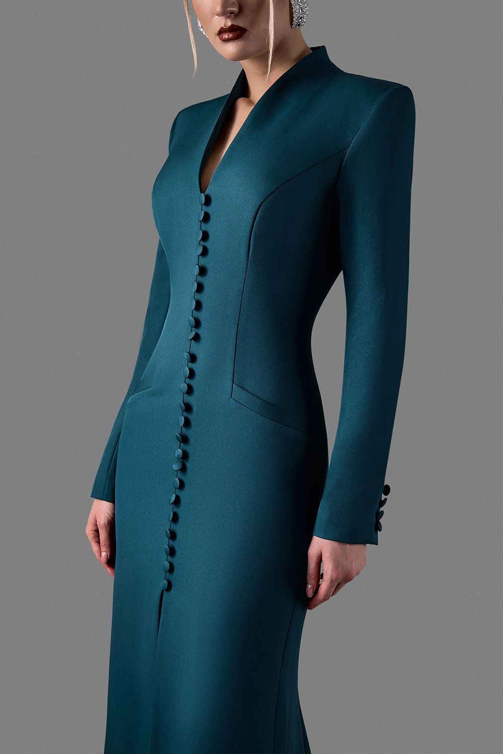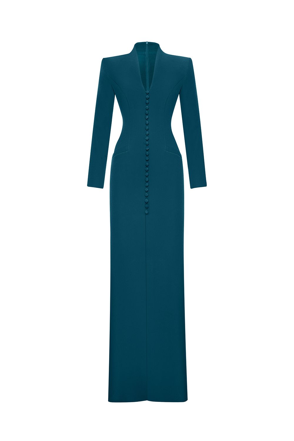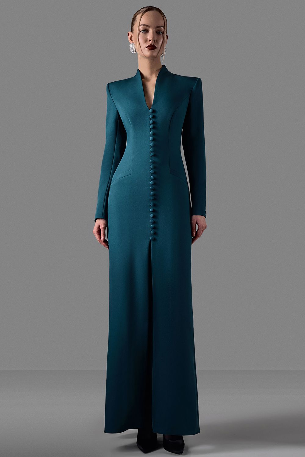 Элегантное платье длины миди. Строгий приталенный крой и вертикальный ряд обтянутых пуговиц визуально вытягивают фигуру, подчеркивая её изящество. Высокий фигурный воротник добавляет образу архитектурной чёткости, а длинные рукава усиливают эффект лаконичности. Длина платья по спинке с учетом стойки: 149 см. Состав: 97% полиэстер, 3% спандекс, подкладка 95% полиэстер, 5% эластан