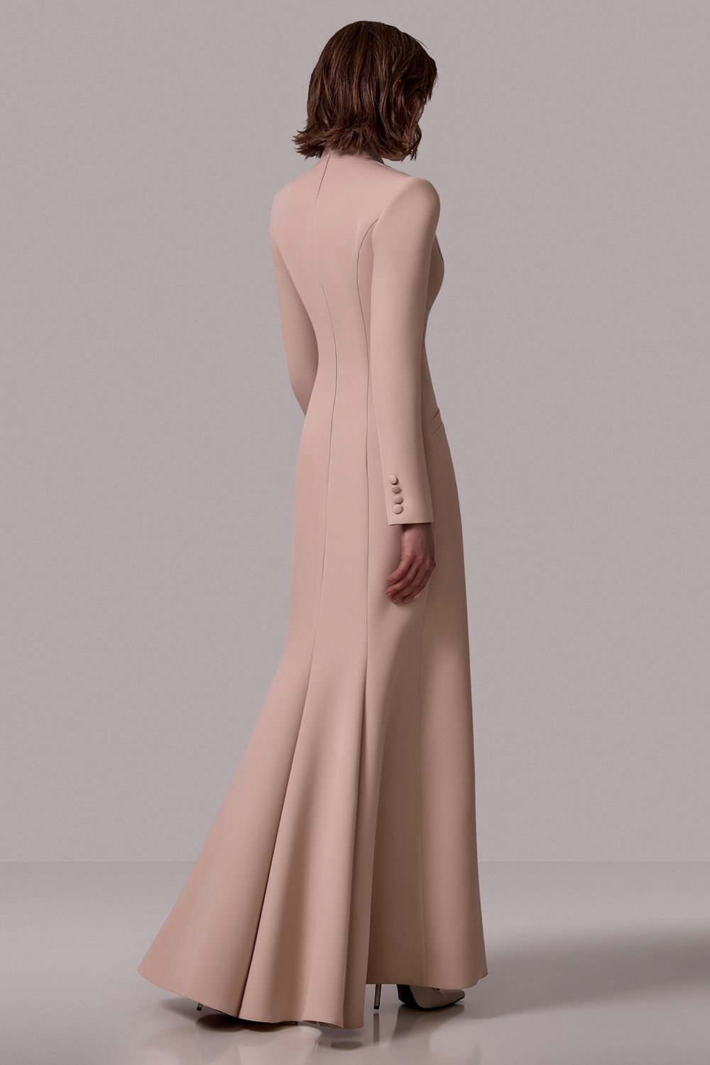 Элегантное платье длины миди. Строгий приталенный крой и вертикальный ряд обтянутых пуговиц визуально вытягивают фигуру, подчеркивая её изящество. Высокий фигурный воротник добавляет образу архитектурной чёткости, а длинные рукава усиливают эффект лаконичности. Длина платья по спинке с учетом стойки: 149 см. Состав: 97% полиэстер, 3% спандекс, подкладка 95% полиэстер, 5% эластан