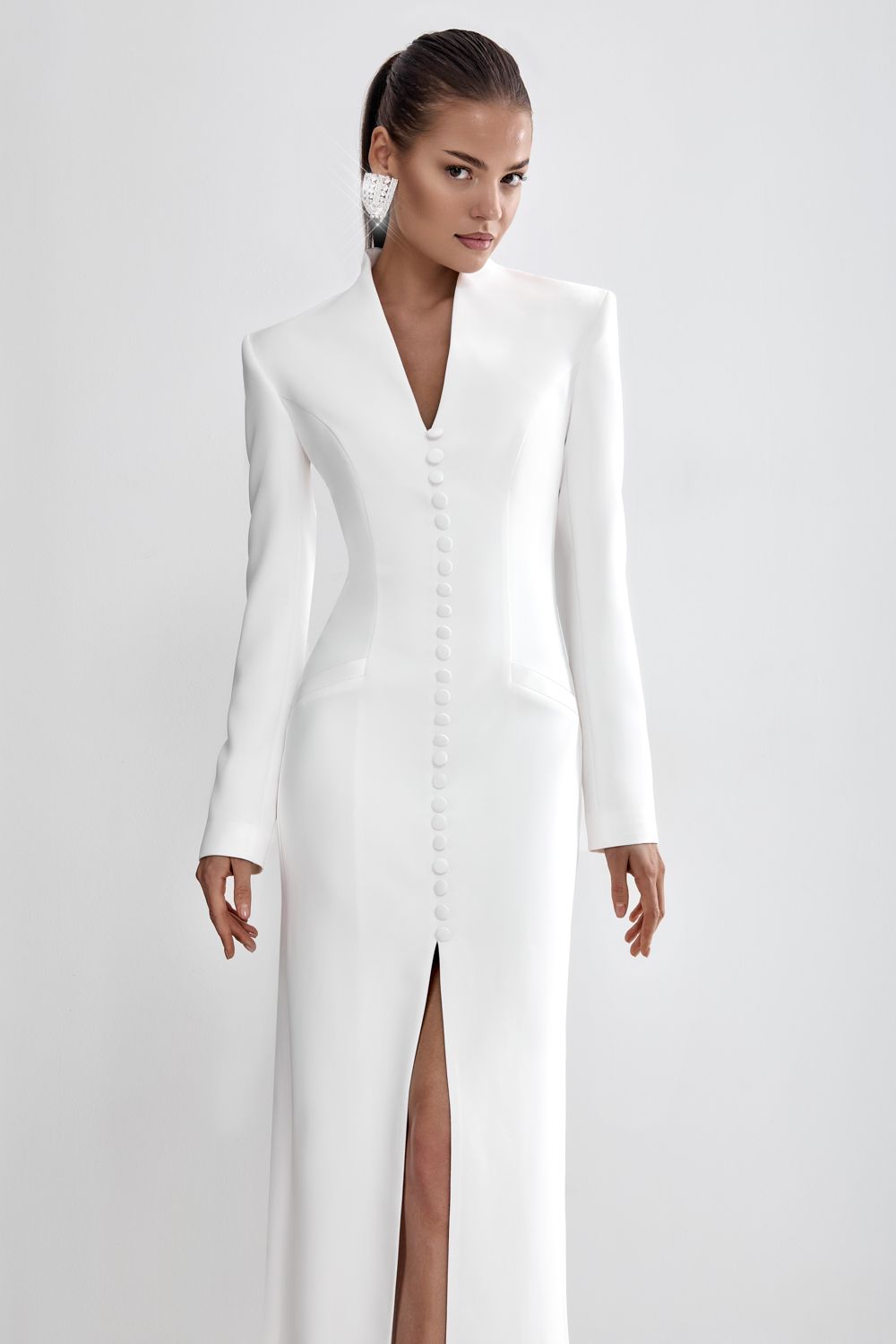 Элегантное платье длины миди. Строгий приталенный крой и вертикальный ряд обтянутых пуговиц визуально вытягивают фигуру, подчеркивая её изящество. Высокий фигурный воротник добавляет образу архитектурной чёткости, а длинные рукава усиливают эффект лаконичности. Длина платья по спинке с учетом стойки: 149 см. Состав: 71% полиэстер, 23% вискоза, 6% эластан. Подкладка: 95% полиэстер 5% эластан.