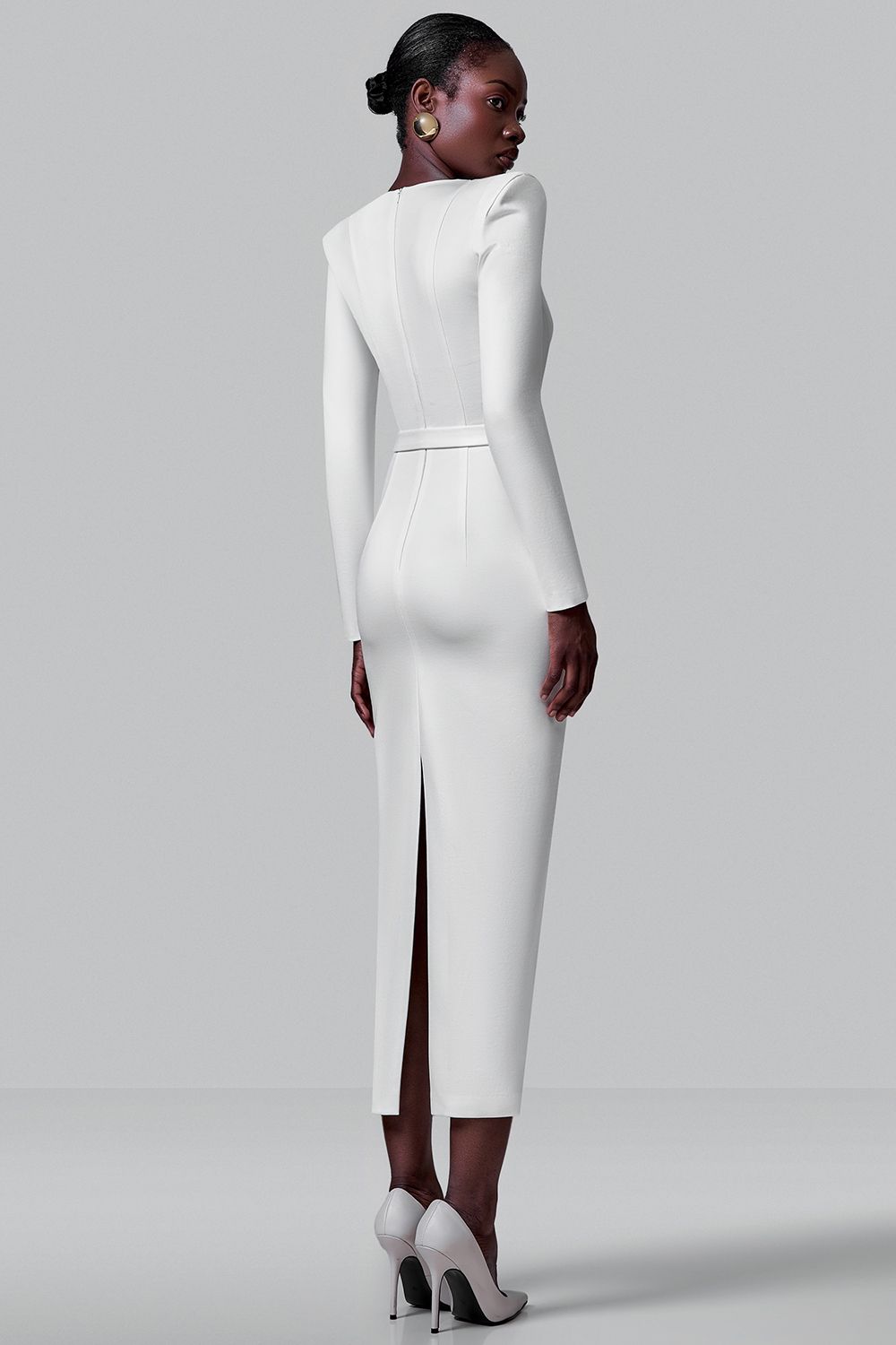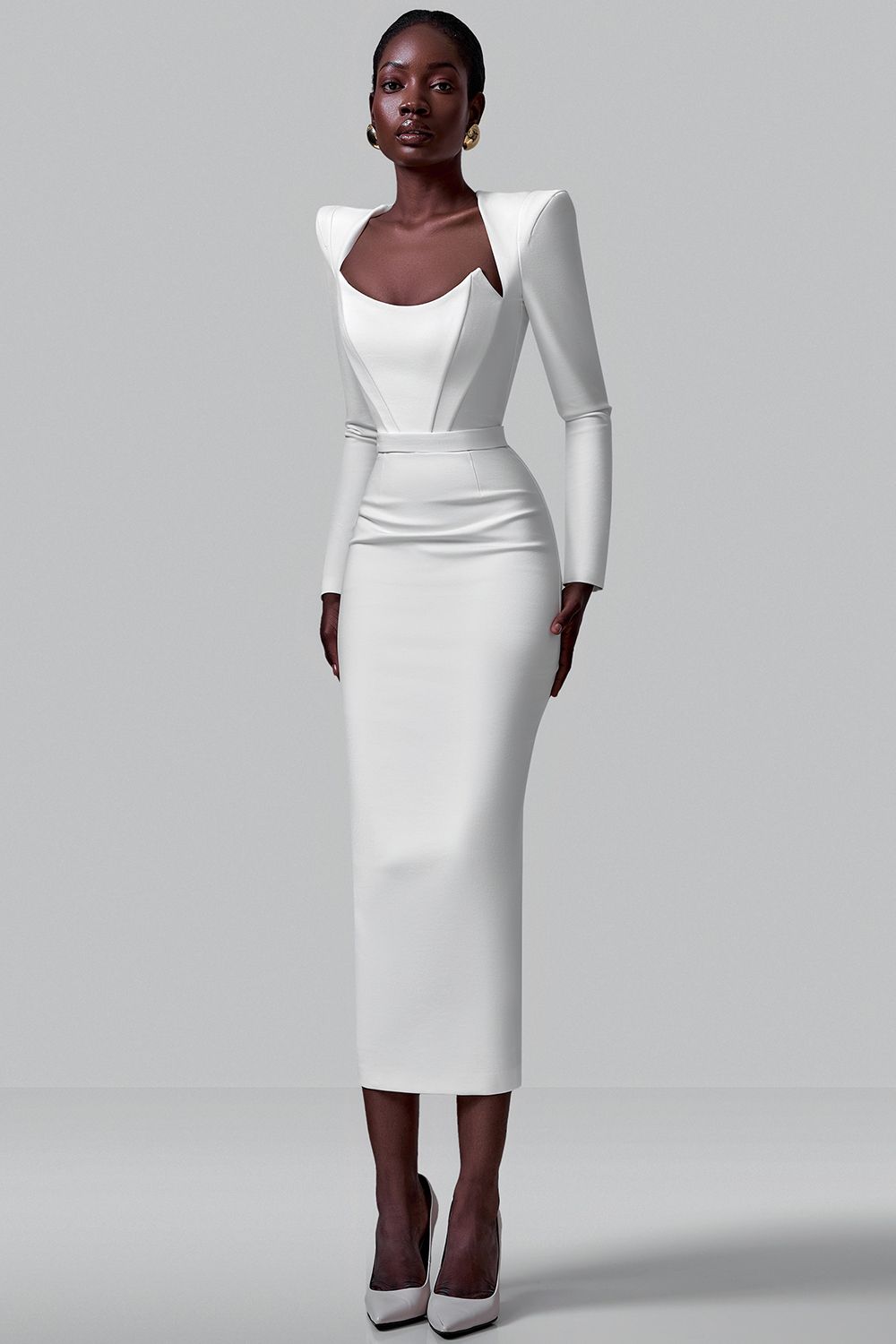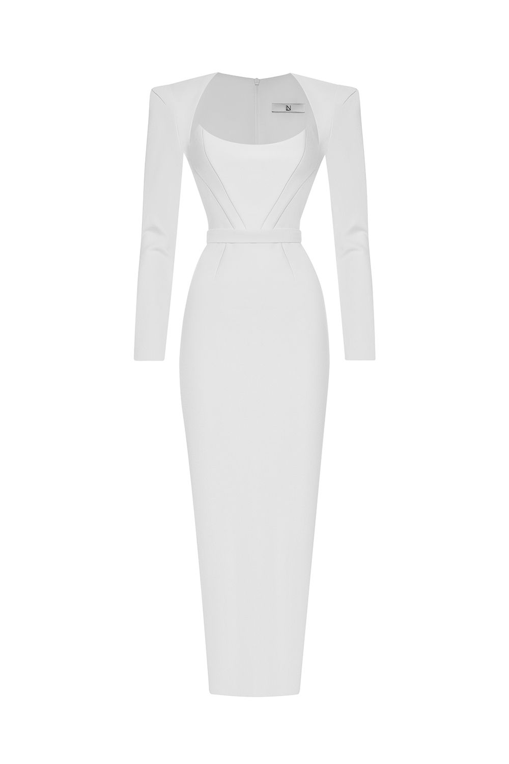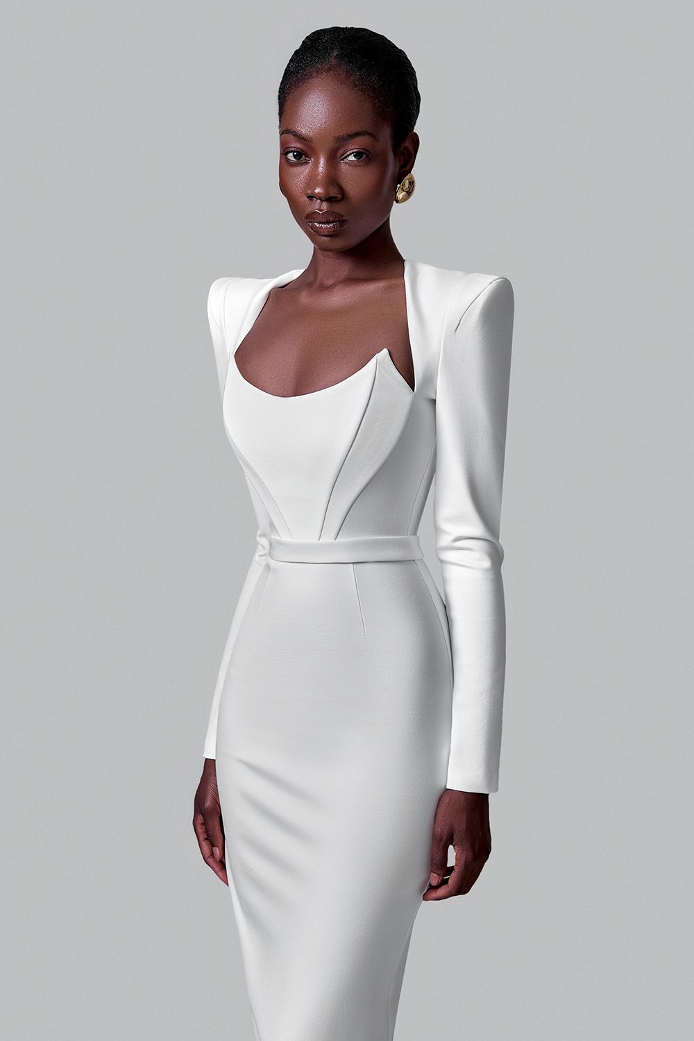Платье длины миди. Футлярный крой подчёркивает фигуру, а продуманные конструктивные элементы создают эффект скульптурности. Длинные рукава и четко очерченные плечи придают образу силу и элегантность, в то время как мягкая линия выреза вносит нотку утончённой чувственности. Минималистичный дизайн позволяет платью быть универсальной основой как для вечернего выхода, так и для статусного дневного мероприятия. Состав:68% вискоза, 27% нейлон, 5% эластан; подкладка: 95% полиэстер, 5% эластан