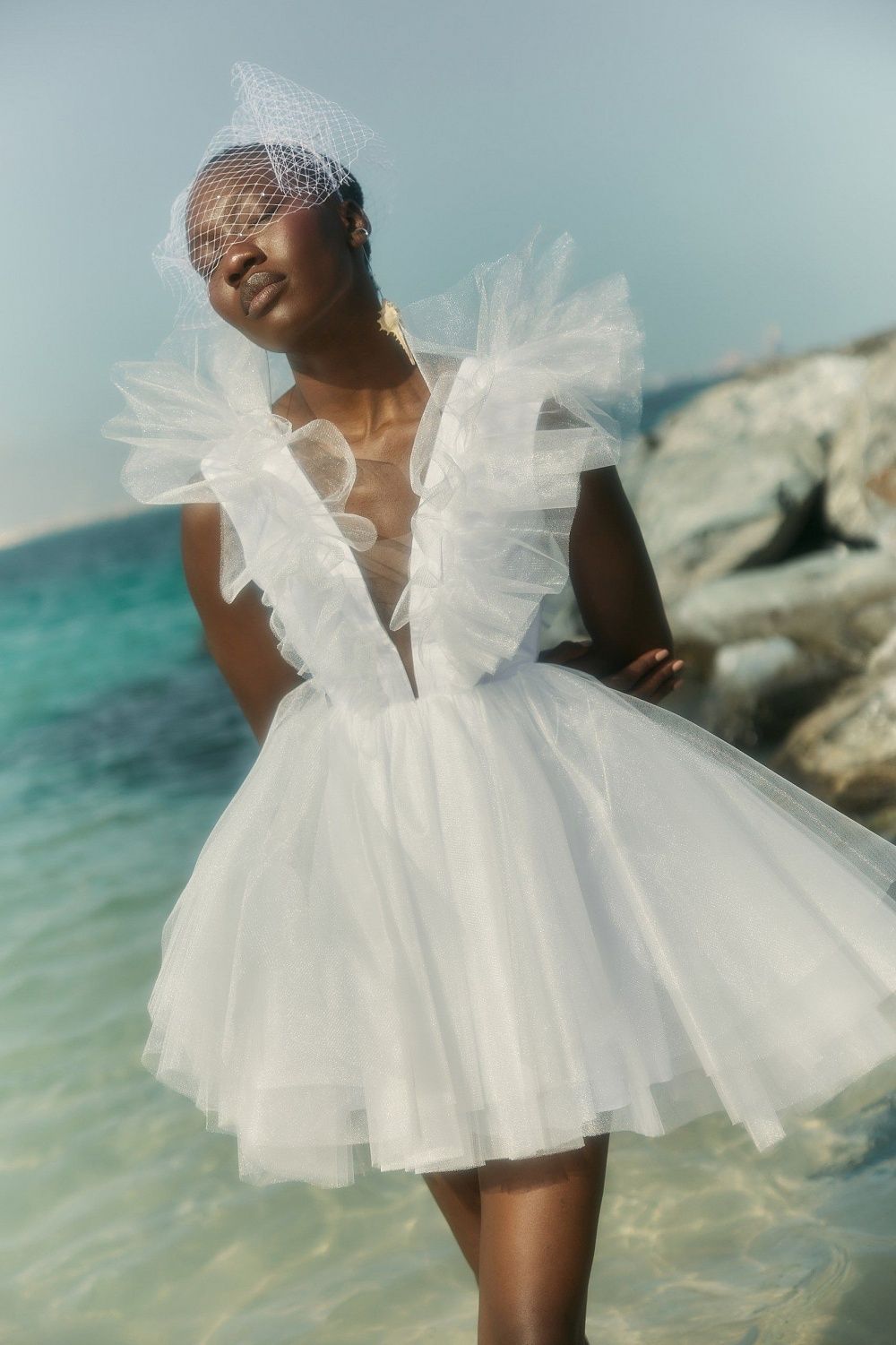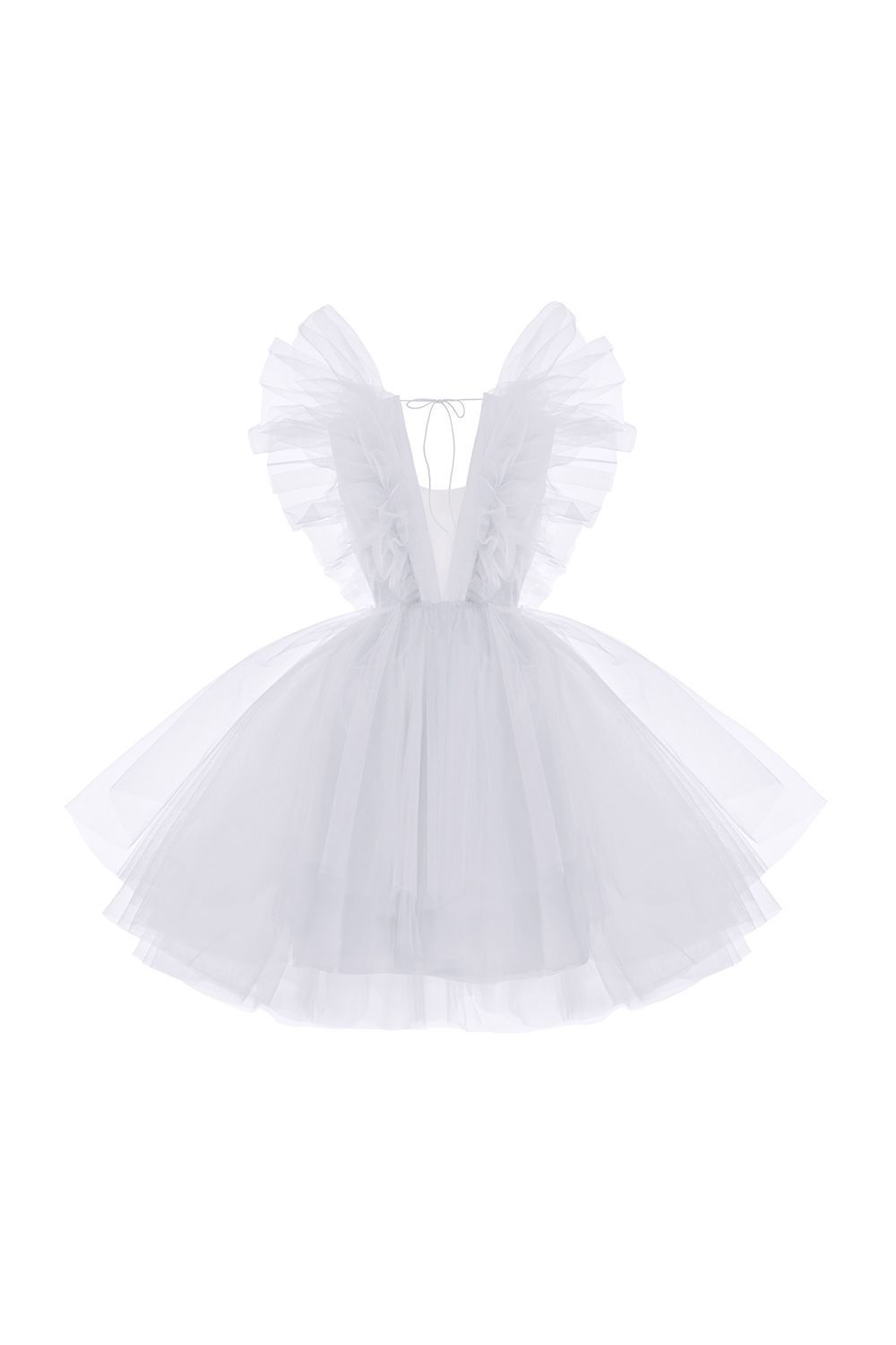 Платье длины мини с пышной юбкой-пачкой и оборками из сетки на лифе. Длина платья по спинке от плеча 91 см. Состав: 100% полиэстер. Подкладка: 95% полиэстер, 5% эластан.