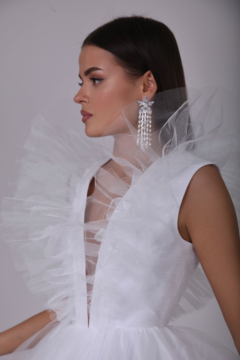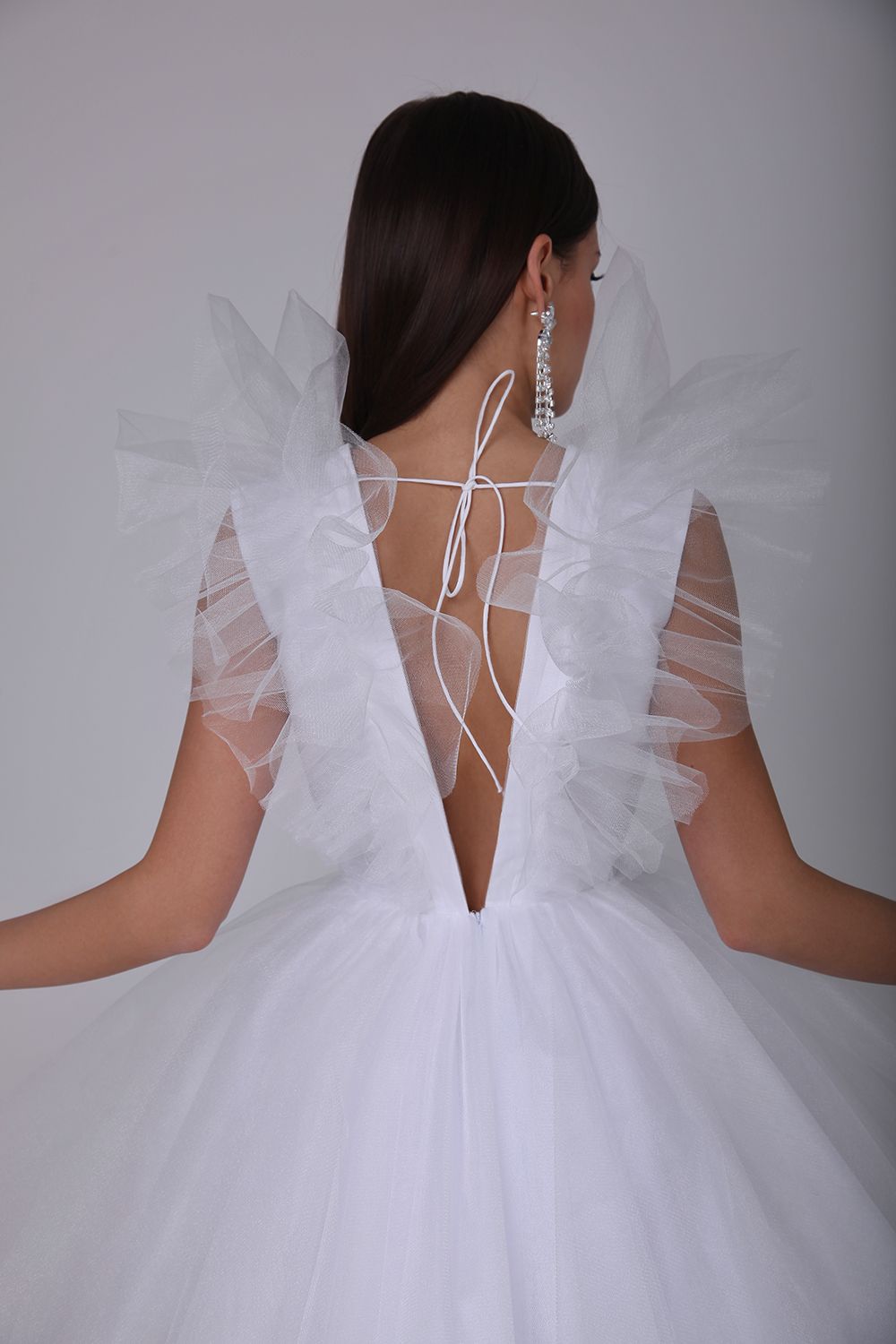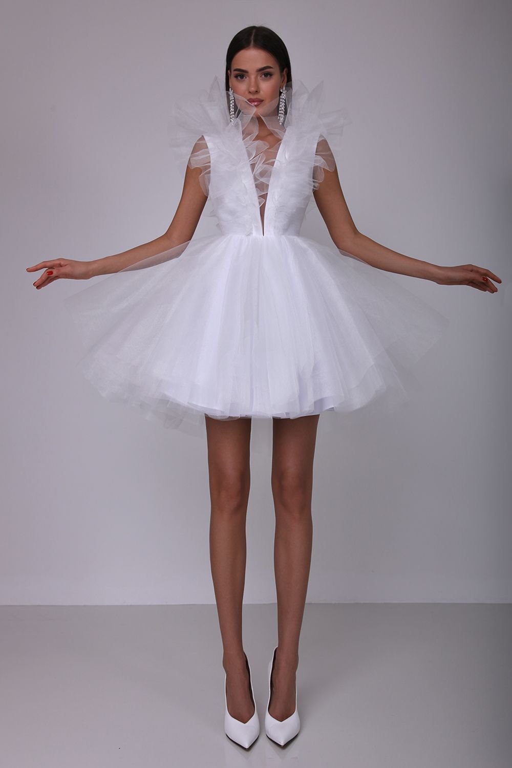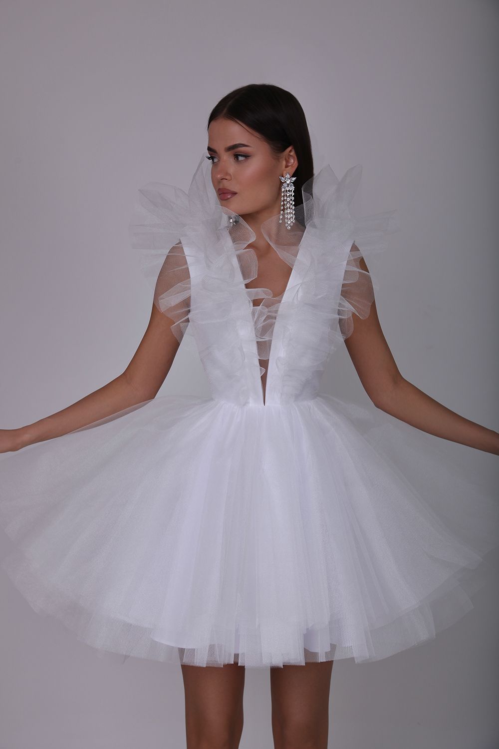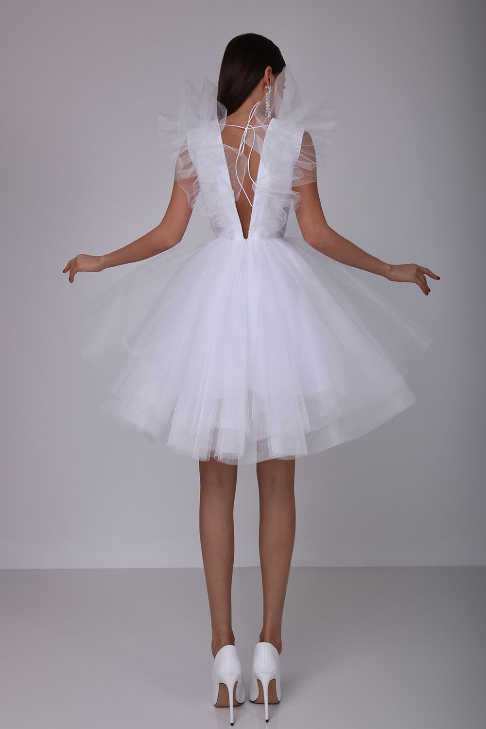 Платье длины мини с пышной юбкой-пачкой и оборками из сетки на лифе. Длина платья по спинке от плеча 91 см. Состав: 100% полиэстер. Подкладка: 95% полиэстер, 5% эластан.