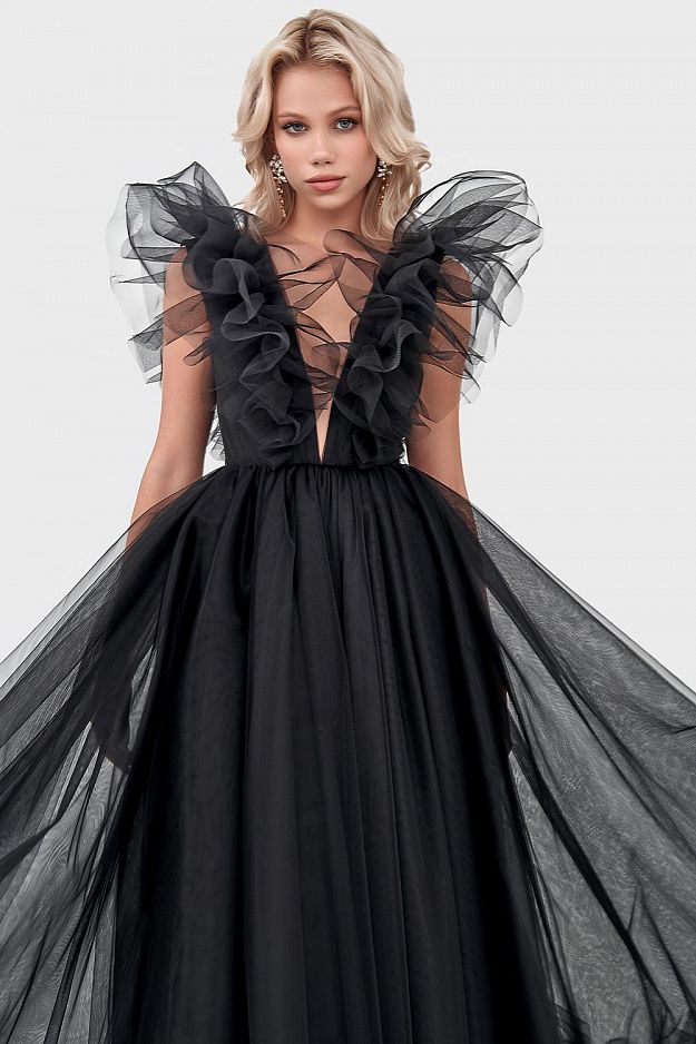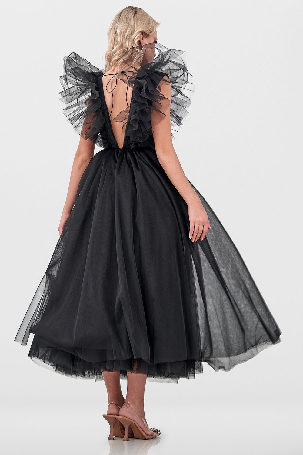 Пышное платье длины миди с глубоким вырезом и открытой спиной. Скрытая молния сзади. Состав: 100% полиэстер, подкладка 95% полиэстер, 5% эластан