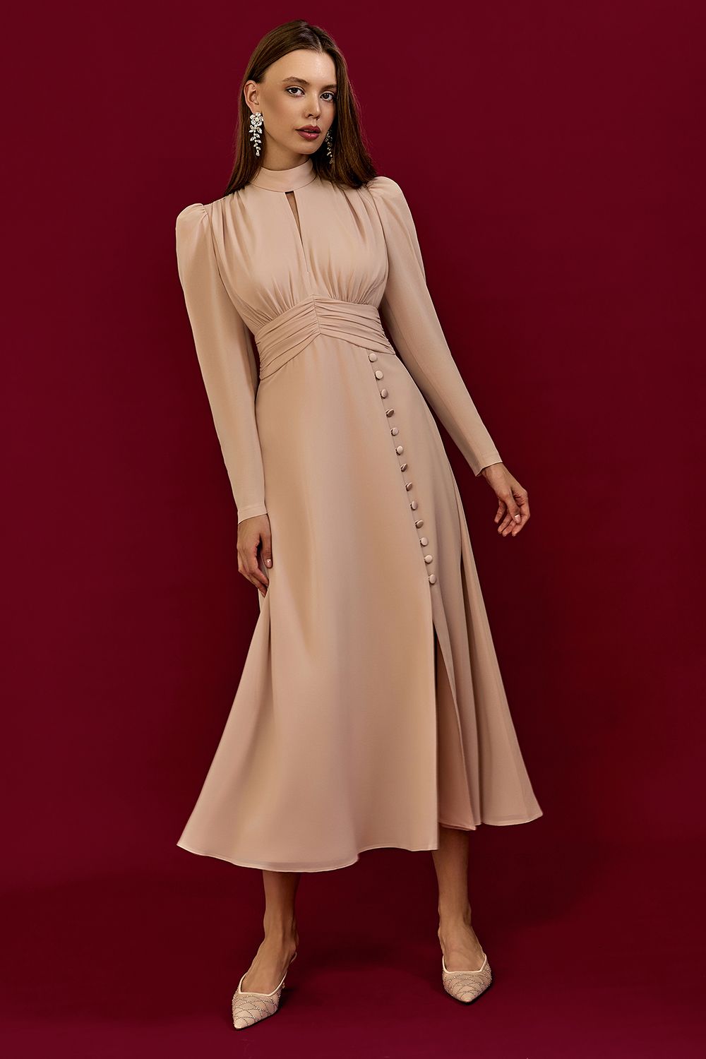 Стильное платье миди с длинными рукавами и изысканным кроем. Модель подчеркивает фигуру благодаря драпировке в области талии и мягким складкам на груди. Высокий разрез с декоративной застежкой на пуговицы добавляет женственности и смелости образу. Подходит для торжественных мероприятий, вечеринок и особых случаев. Состав: 100% полиэстер, подкладка 97% полиэстер, 3% эластан