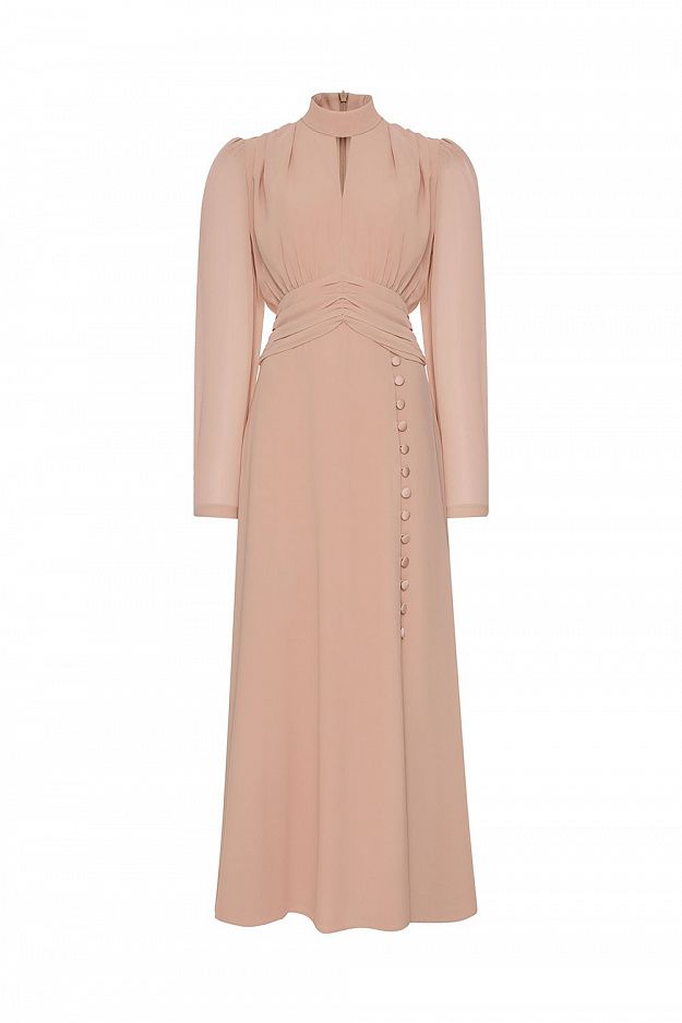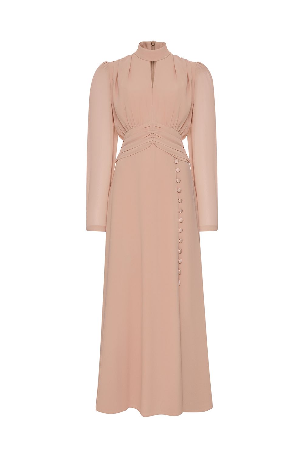 Стильное платье миди с длинными рукавами и изысканным кроем. Модель подчеркивает фигуру благодаря драпировке в области талии и мягким складкам на груди. Высокий разрез с декоративной застежкой на пуговицы добавляет женственности и смелости образу. Подходит для торжественных мероприятий, вечеринок и особых случаев. Состав: 100% полиэстер, подкладка 97% полиэстер, 3% эластан