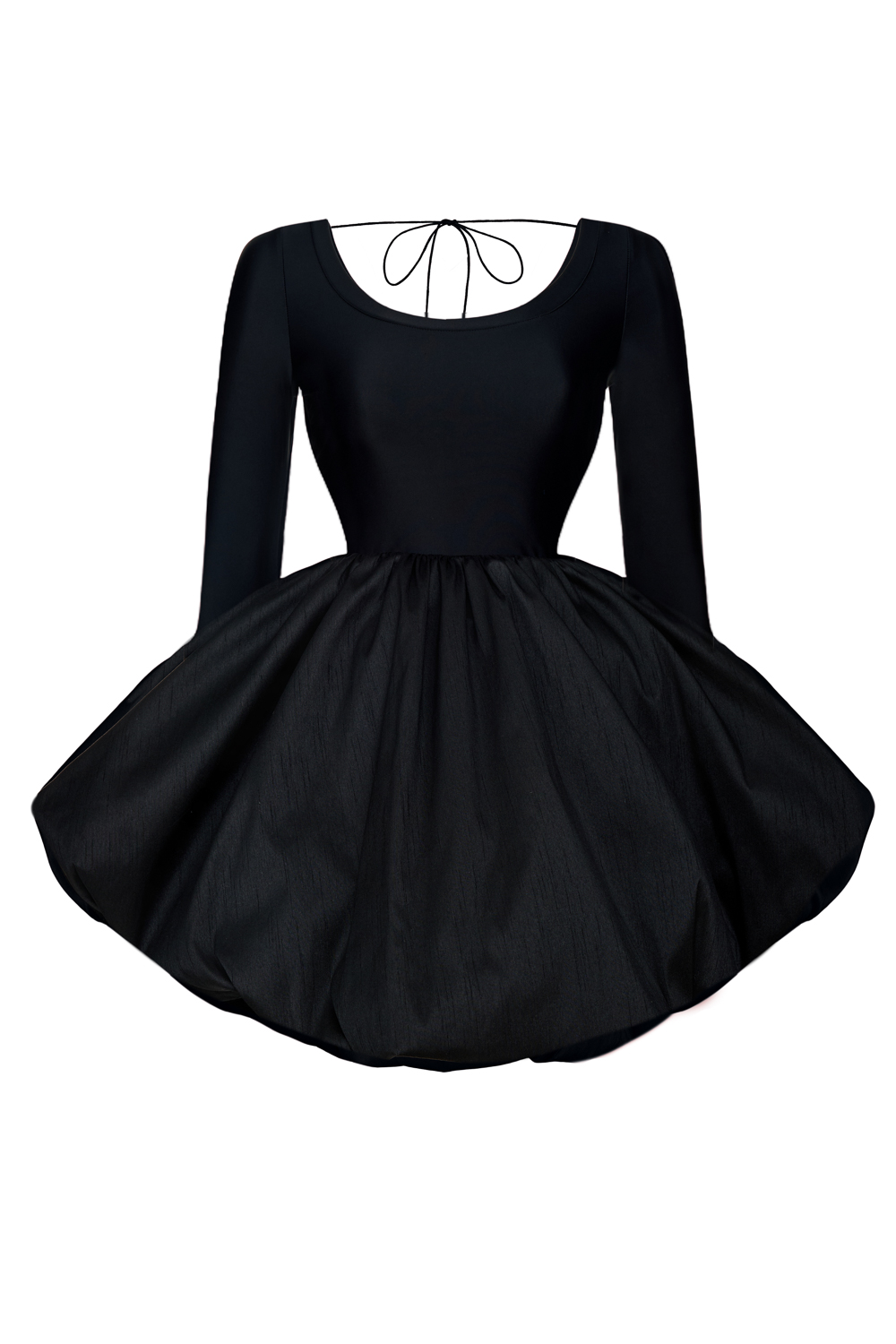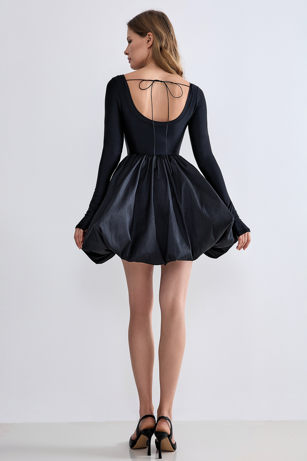 Платье-мини с пышной юбкой и открытой спиной, вдохновленное балетным платьем-пачкой. Длина по спинке 34 см, длина от талии 49 см, длина рукава 70 см. Состав: верх 95% полиэстер, 5% спандекс, низ 88% полиэстер, 12% вискоза. Подкладка: 95% полиэстер, 5% эластан.