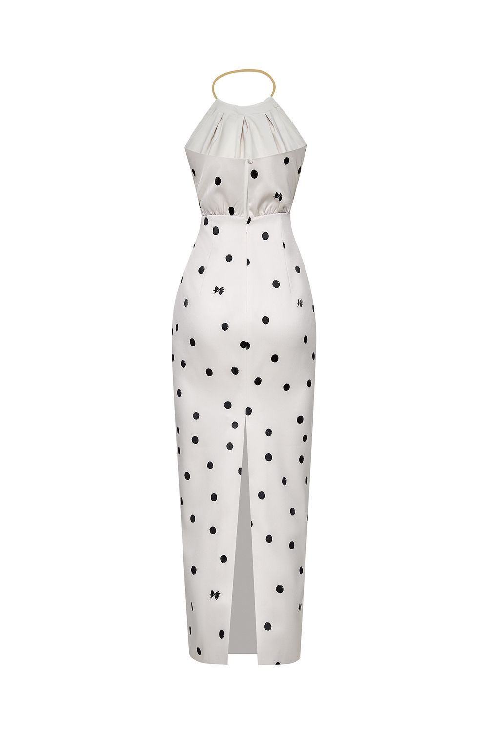 Элегантное платье из атласной ткани с благородным блеском и контрастным гороховым принтом. Модель состоит из двух деталей: основы с открытым верхом на кольце-халтере и съёмной накидки с длинным рукавом. Деталь с рукавом легко фиксируется и снимается, позволяя менять образ — от утончённого вечернего силуэта до более сдержанного и закрытого. Состав: 100% полиэстер, подкладка 95% полиэстер, 5% эластан