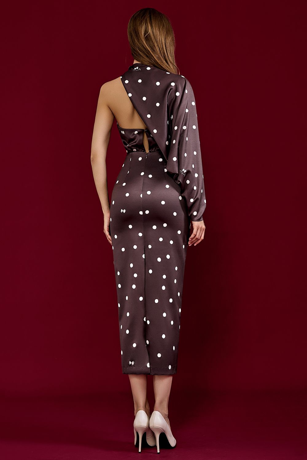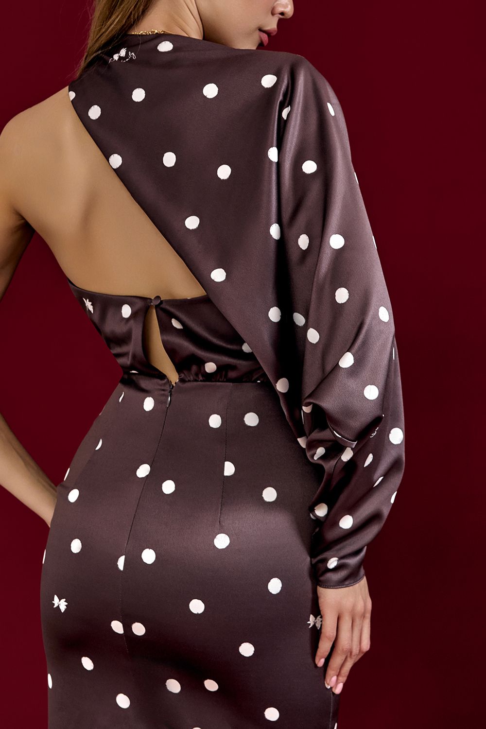 Элегантное платье из атласной ткани с благородным блеском и контрастным гороховым принтом. Модель состоит из двух деталей: основы с открытым верхом на кольце-халтере и съёмной накидки с длинным рукавом. Деталь с рукавом легко фиксируется и снимается, позволяя менять образ — от утончённого вечернего силуэта до более сдержанного и закрытого. Состав: 100% полиэстер, подкладка 95% полиэстер, 5% эластан