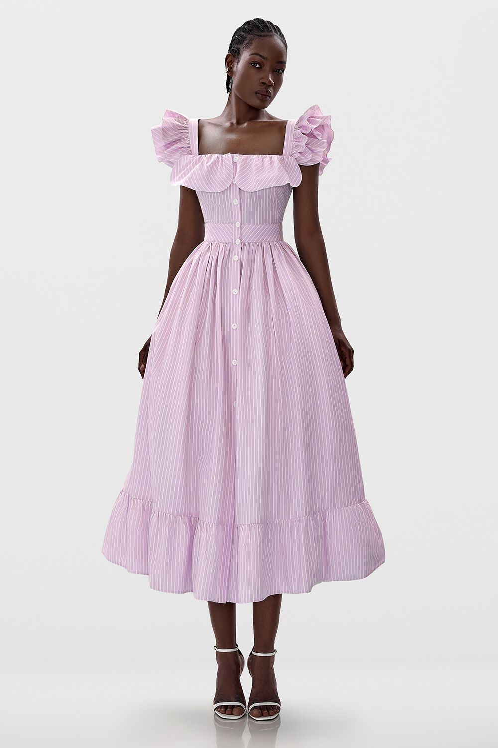 Сарафан на широких бретелях с оборками на груди, застегивается на пуговицы спереди. Широкий втачной пояс, идеально подчеркнет линию талии. Подол с оборками. На модели размер S. Длина по спинке 108 см. Состав: 60% полиэстер, 40% хлопок