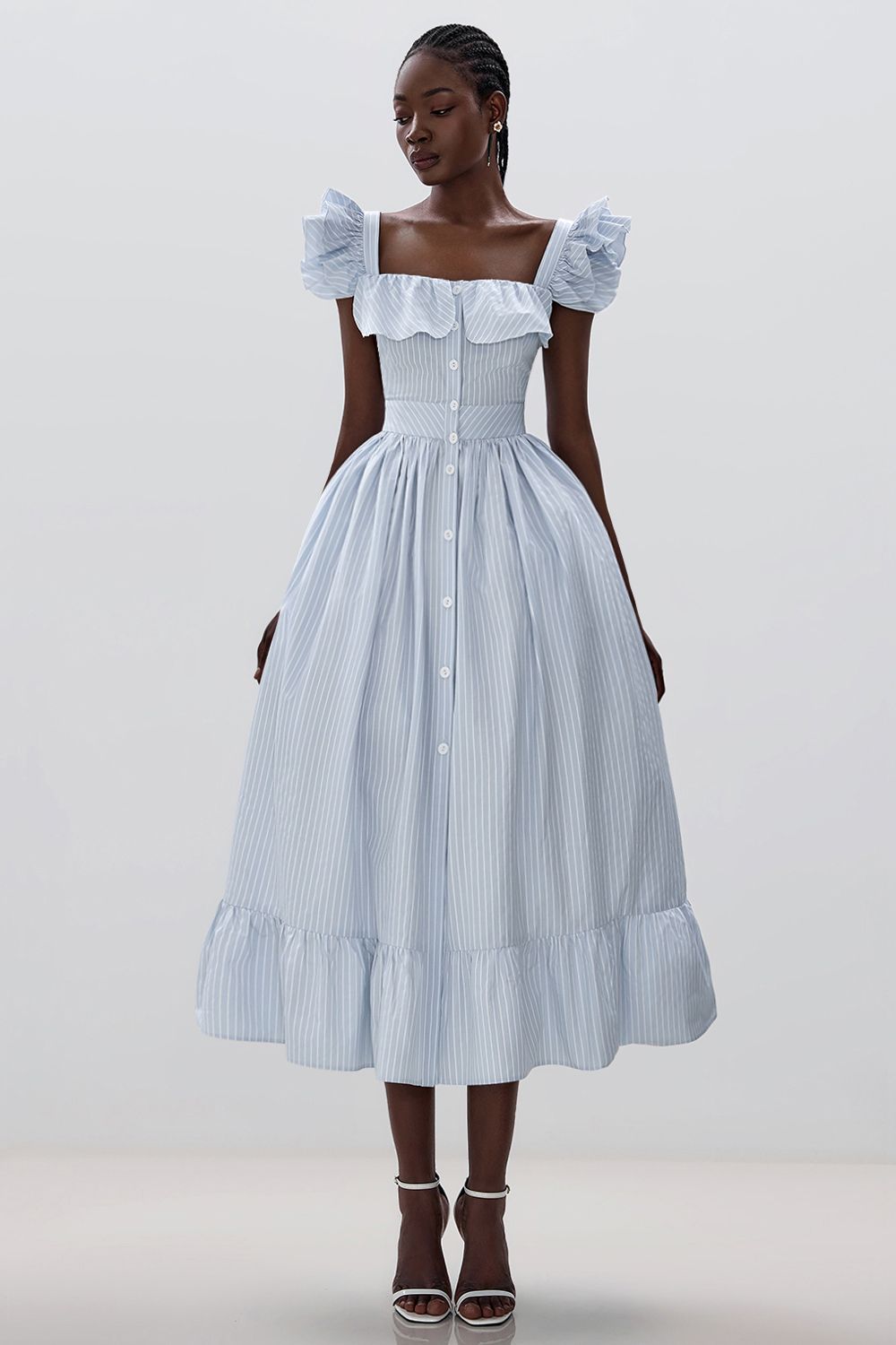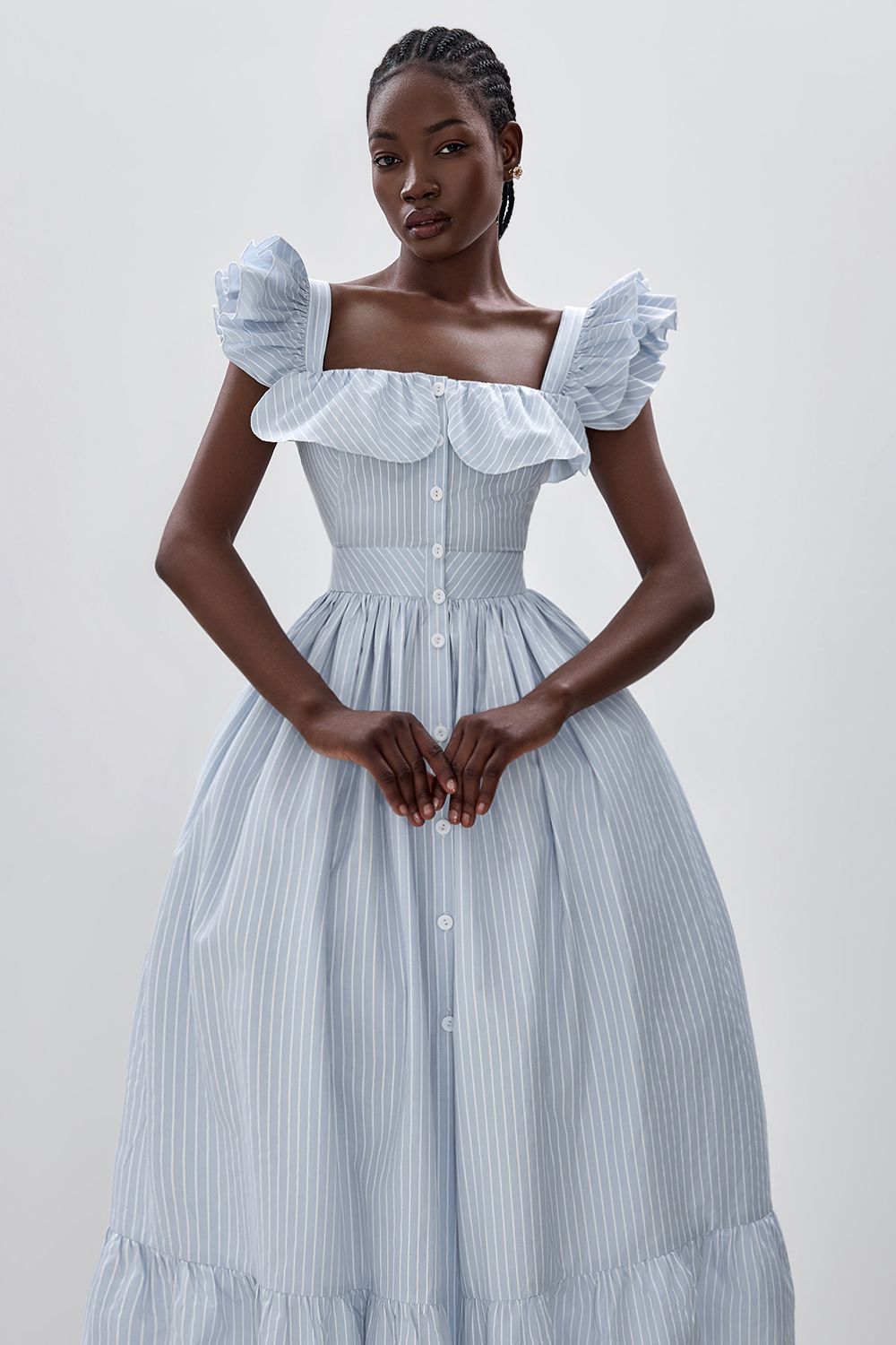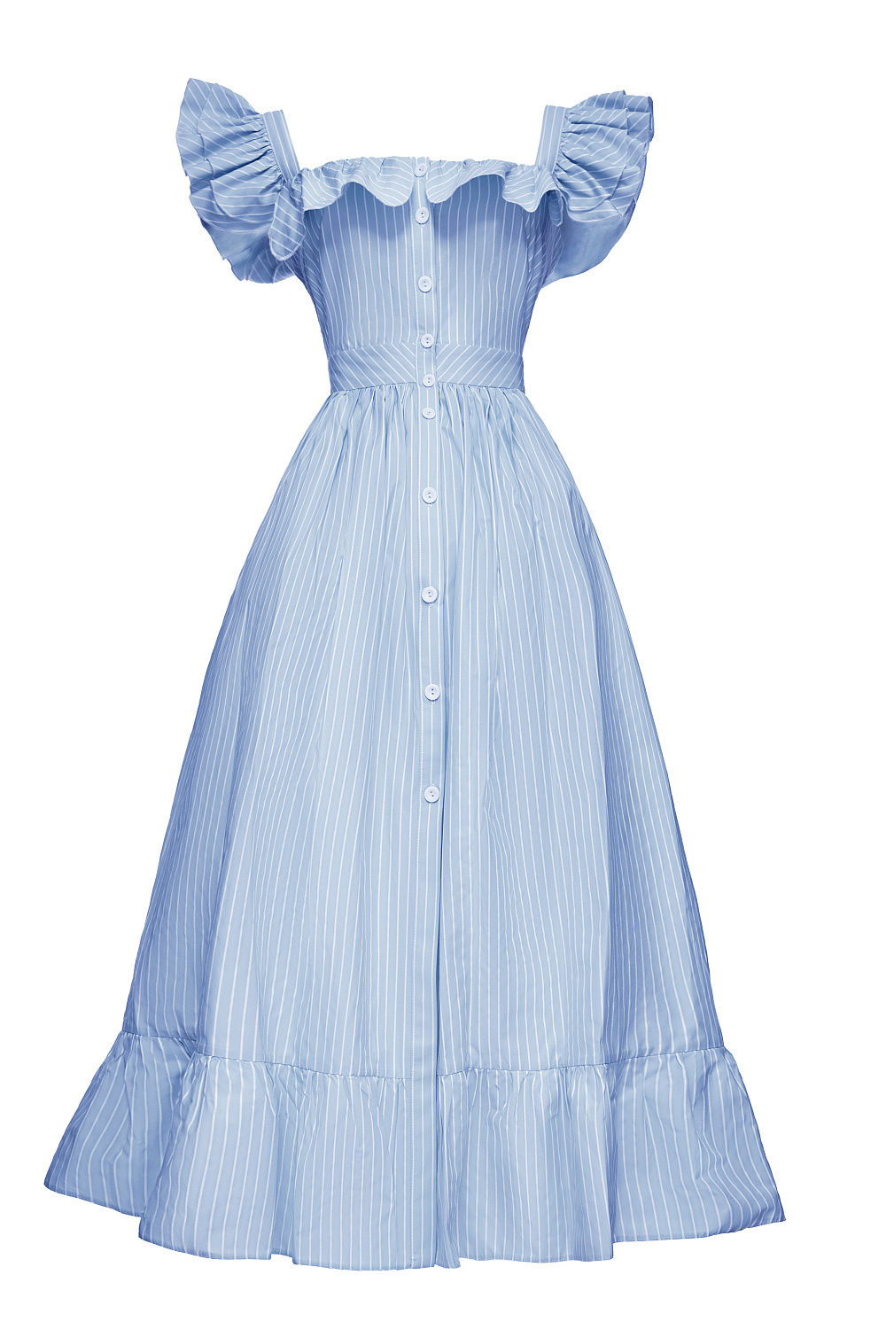 Сарафан на широких бретелях с оборками на груди, застегивается на пуговицы спереди. Широкий втачной пояс, идеально подчеркнет линию талии. Подол с оборками. На модели размер S. Длина по спинке 108 см. Состав: 60% полиэстер, 40% хлопок