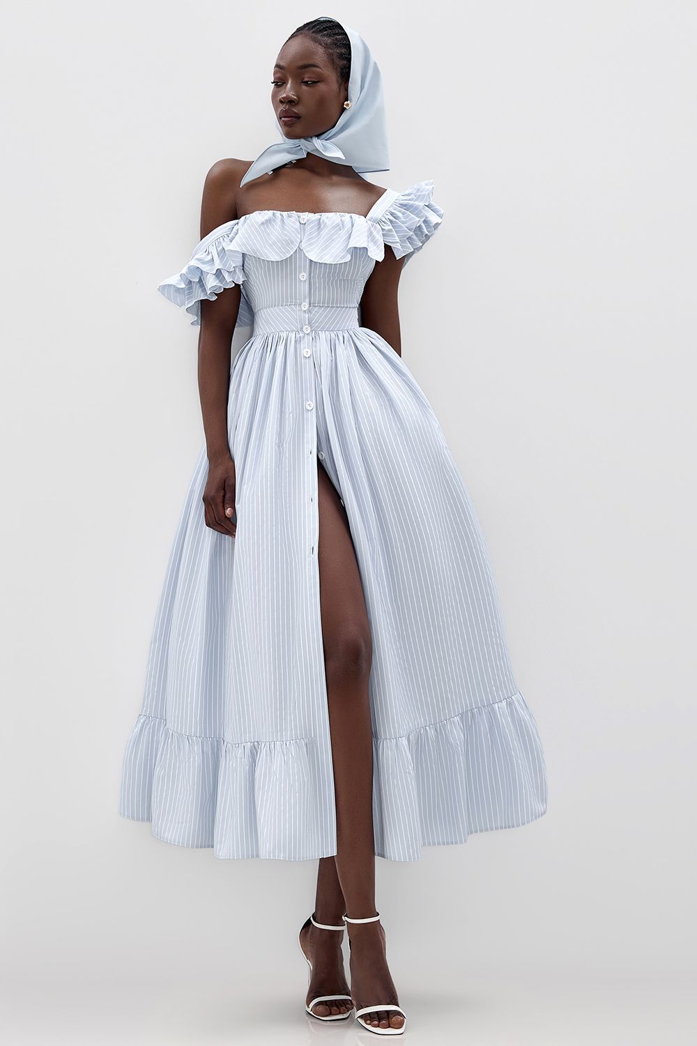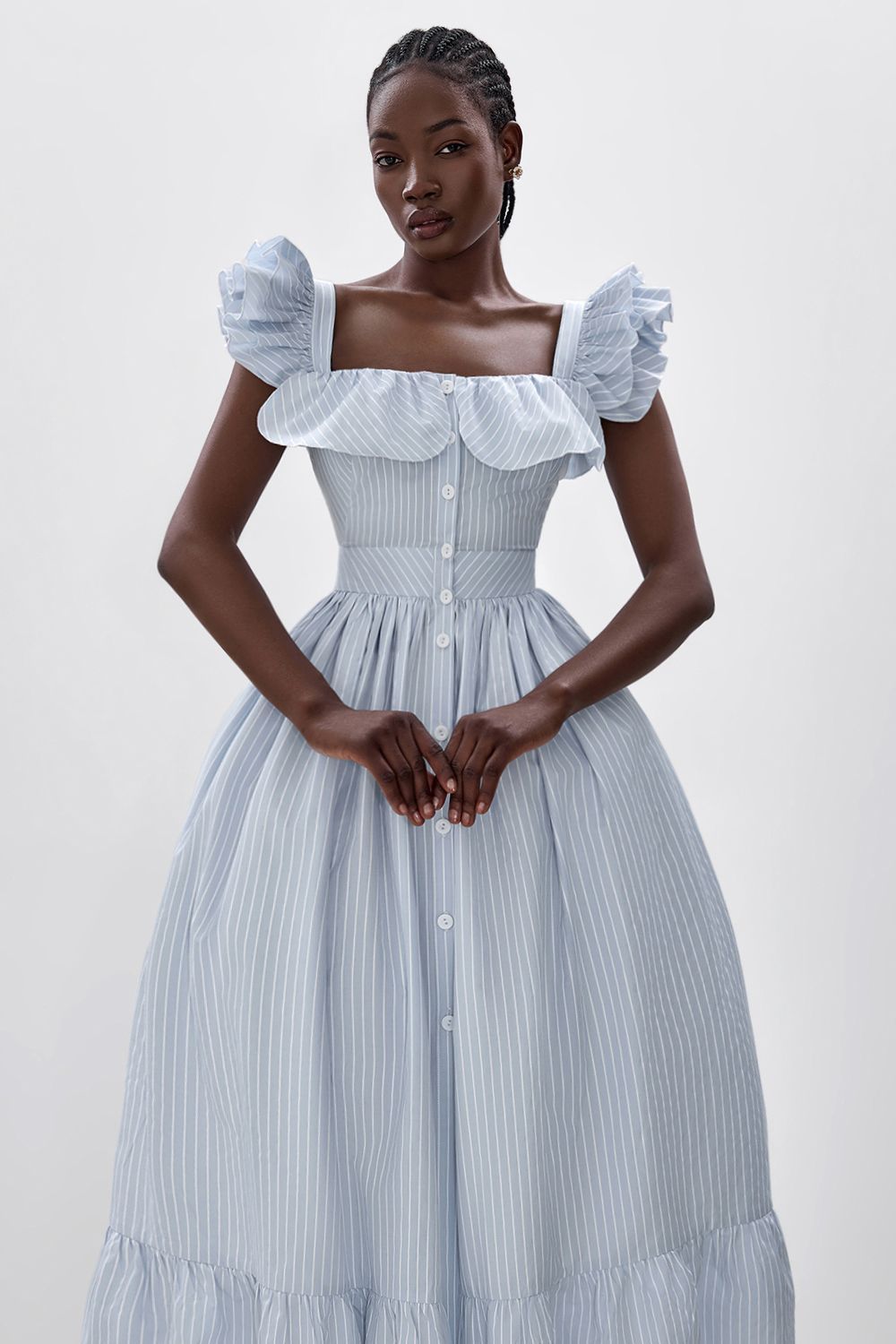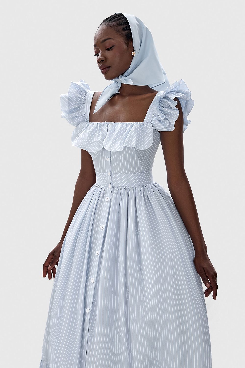 Сарафан на широких бретелях с оборками на груди, застегивается на пуговицы спереди. Широкий втачной пояс, идеально подчеркнет линию талии. Подол с оборками. На модели размер S. Длина по спинке 108 см. Состав: 60% полиэстер, 40% хлопок