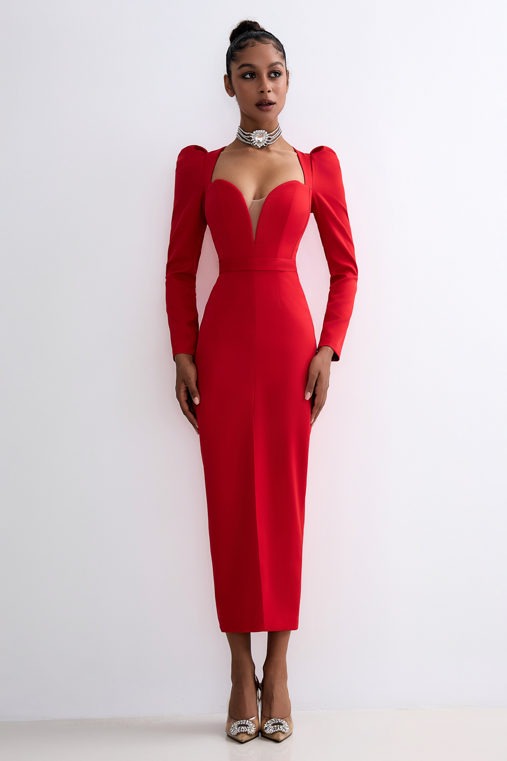 Платье миди из плотной костюмной ткани с эффектом лёгкой коррекции фигуры. Глубокий фигурный вырез и длинные рукава создают гармоничный баланс откровенности и элегантности. Вертикальный разрез спереди обеспечивает свободу движений и визуально удлиняет силуэт. Состав: 71% полиэстер, 23% вискоза, 6% эластан, Подклад 95% полиэстер 5% эластан
