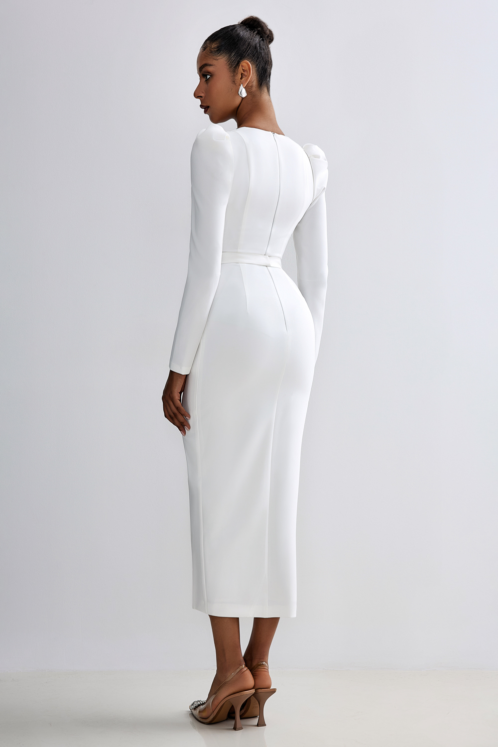 Платье миди из плотной костюмной ткани с эффектом лёгкой коррекции фигуры. Глубокий фигурный вырез и длинные рукава создают гармоничный баланс откровенности и элегантности. Вертикальный разрез спереди обеспечивает свободу движений и визуально удлиняет силуэт. Состав: 71% полиэстер, 23% вискоза, 6% эластан, Подклад 95% полиэстер 5% эластан
