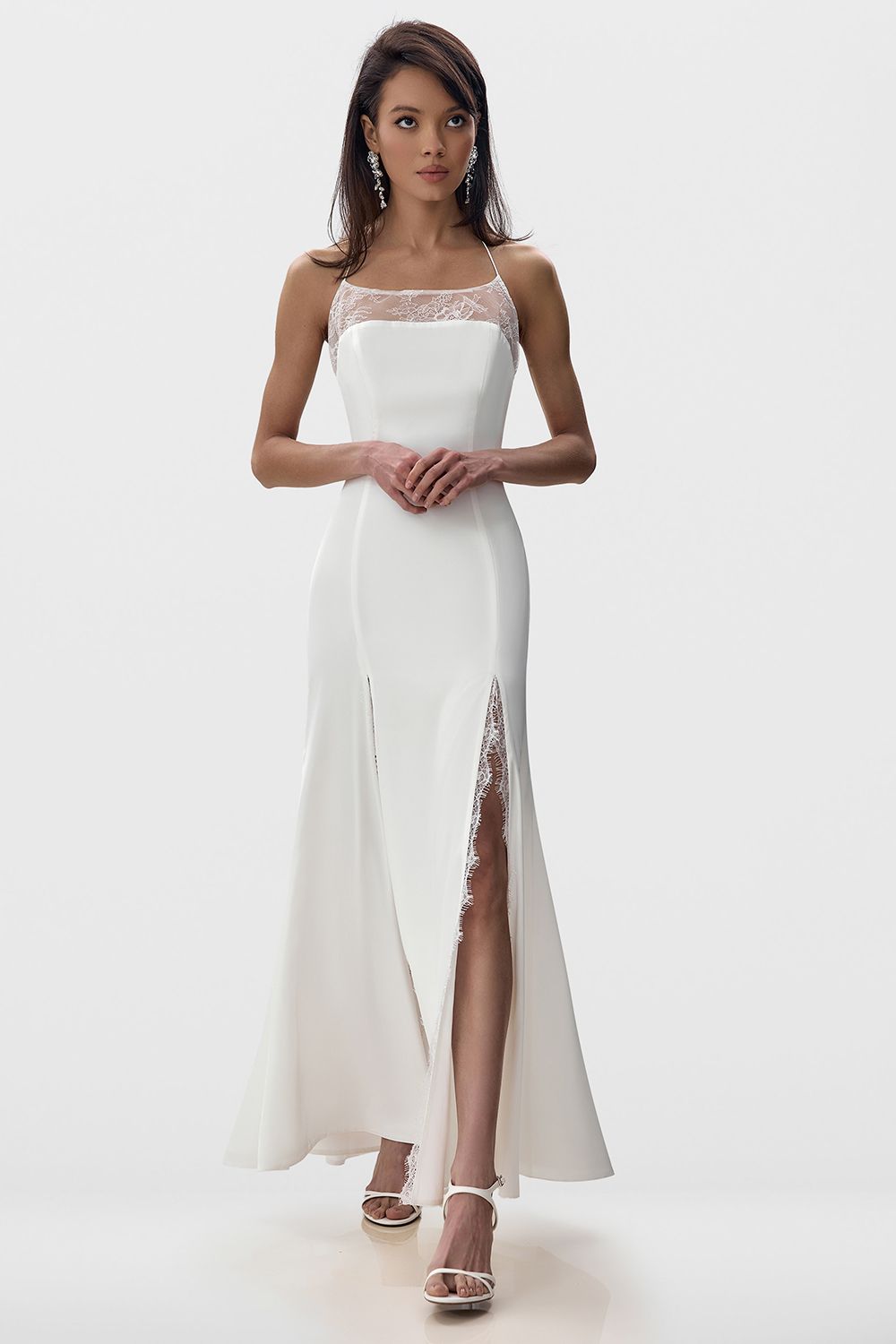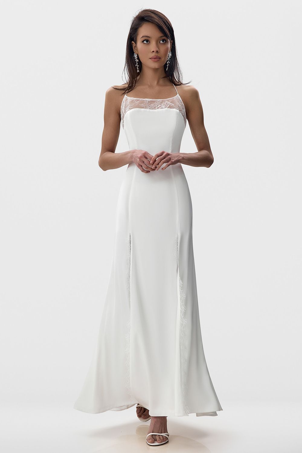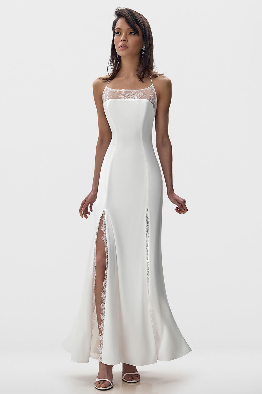 Утончённое платье миди на тонких бретелях с кружевной отделкой, акцентированной в зоне лифа и по бокам юбки. Приталенный силуэт мягко подчёркивает фигуру, а разрезы придают образу лёгкость и изысканную женственность. Универсальная модель — для особого случая или летнего выхода. Состав:Ткань: 97% полиэстер, 3% спандекс Подкладка: 97% полиэстер, 3% эластан