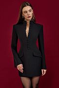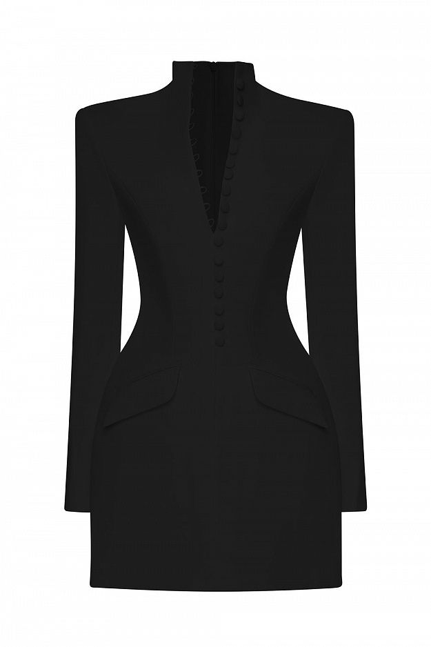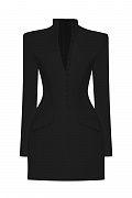 Элегантное мини-платье строгого кроя с длинным рукавом. Модель выполнена в стиле жакета с выразительными плечами, приталенным силуэтом и имитацией клапанов карманов. Визуальный акцент — глубокий V-образный вырез с оригинальной застежкой на ряд обтянутых пуговиц. Идеальный выбор для вечернего выхода или стильного коктейльного образа. Длина платья: 80,5 (размер: S). Состав: 71% полиэстер, 23% вискоза, 6% эластан, Подклад 95% полиэстер 5% эластан