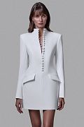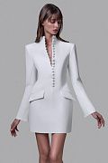 Элегантное мини-платье строгого кроя с длинным рукавом. Модель выполнена в стиле жакета с выразительными плечами, приталенным силуэтом и имитацией клапанов карманов. Визуальный акцент — глубокий V-образный вырез с оригинальной застежкой на ряд обтянутых пуговиц. Идеальный выбор для вечернего выхода или стильного коктейльного образа. Длина платья: 80,5 (размер: S). Состав: 71% полиэстер, 23% вискоза, 6% эластан, Подклад 95% полиэстер 5% эластан