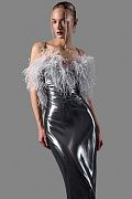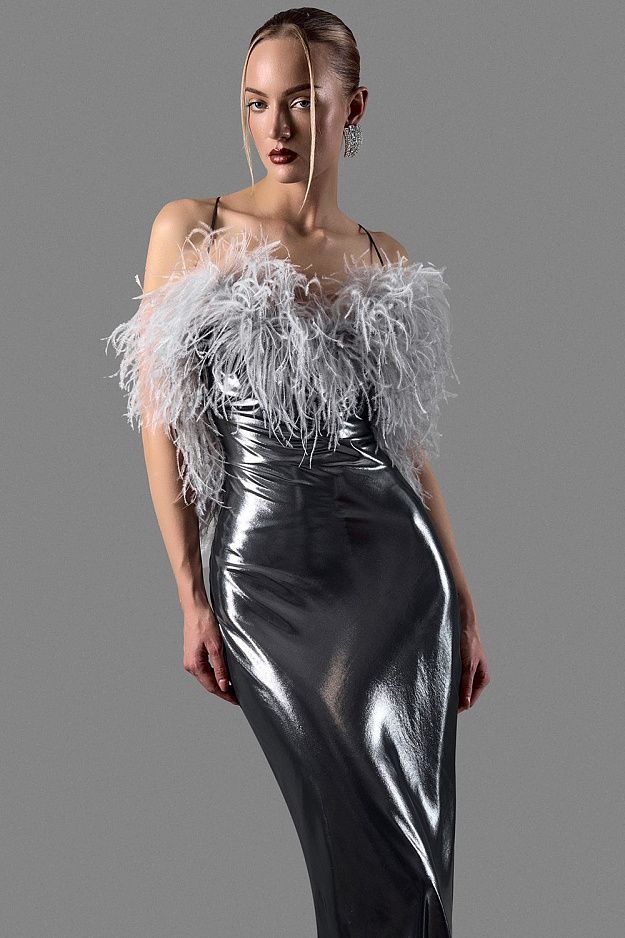Платье-комбинация макси из металлизированной ткани. Верх украшен объемным декором из перьев - они создают воздушное облако вокруг линии декольте и делают образ особенно выразительным. Спинка открытая, с тонкими бретелями, которые регулируются по длине. За счёт плотного, но пластичного материала платье идеально подчеркивает силуэт. Состав: 100% полиэстер, подкладка 97% полиэстер, 3% эластан