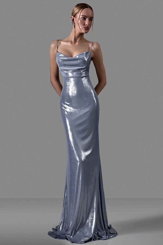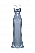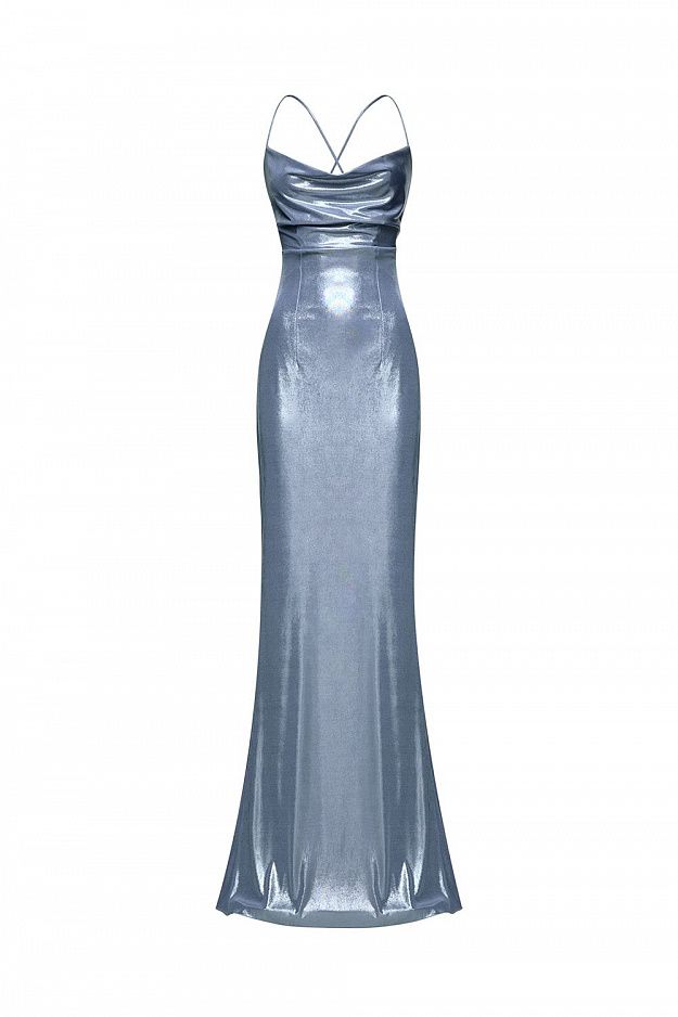 Модель с мягким драпированным лифом и тонкими бретелями, которые эффектно перекрещиваются на спине и регулируются завязками. Акцент на открытой спине и приталенном силуэте, плавно переходящем в расклёшенный подол. Ткань с глянцевым блеском подчеркивает каждое движение и создаёт лёгкое свечение при любом освещении. Идеальный выбор для вечернего выхода, коктейльной вечеринки или торжественного события. Состав: 67% полиэстер, 30% вискоза, 3% эластан; подкладка 100% нейлон