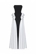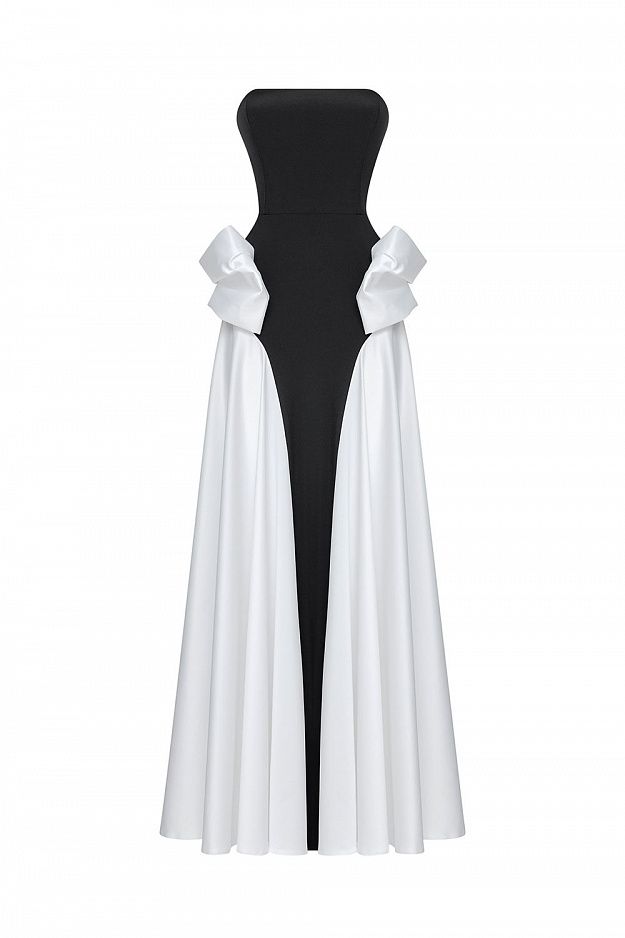 Эффектное вечернее платье с архитектурным силуэтом. Верх выполнен в виде лаконичного бюстье, подчеркивающего линию плеч и декольте. Основная часть - из плотного материала, визуально стройнящего фигуру. Контрастные вставки из мягкой ткани создают изысканное движение при ходьбе. Ключевой акцент - крупные декоративные банты по бокам, придающие образу графичность и couture-настроение. Состав: 95% полиэстер, 5% спандекс, Подкладка 95% полиэстер, 5% эластан.