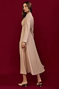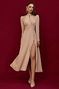 Стильное платье миди с длинными рукавами и изысканным кроем. Модель подчеркивает фигуру благодаря драпировке в области талии и мягким складкам на груди. Высокий разрез с декоративной застежкой на пуговицы добавляет женственности и смелости образу. Подходит для торжественных мероприятий, вечеринок и особых случаев. Состав: 100% полиэстер, подкладка 97% полиэстер, 3% эластан
