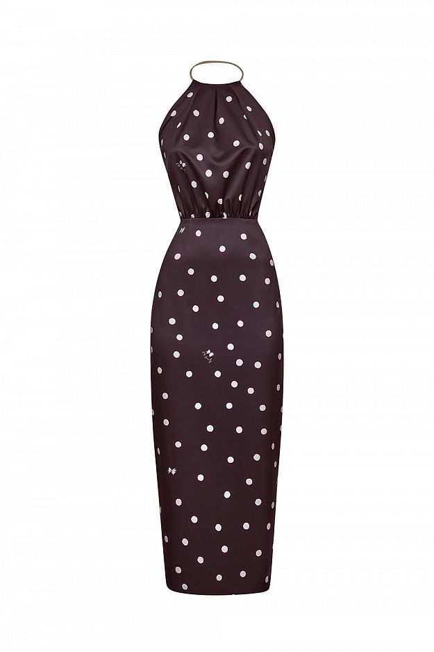 Элегантное платье из атласной ткани с благородным блеском и контрастным гороховым принтом. Модель состоит из двух деталей: основы с открытым верхом на кольце-халтере и съёмной накидки с длинным рукавом. Деталь с рукавом легко фиксируется и снимается, позволяя менять образ — от утончённого вечернего силуэта до более сдержанного и закрытого. Состав: 100% полиэстер, подкладка 95% полиэстер, 5% эластан