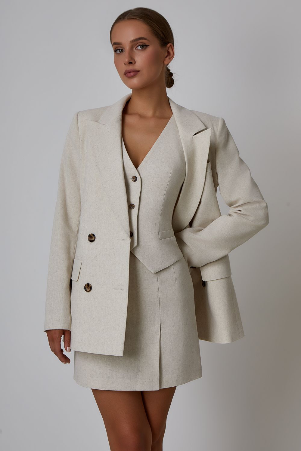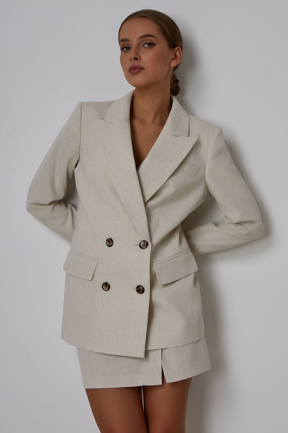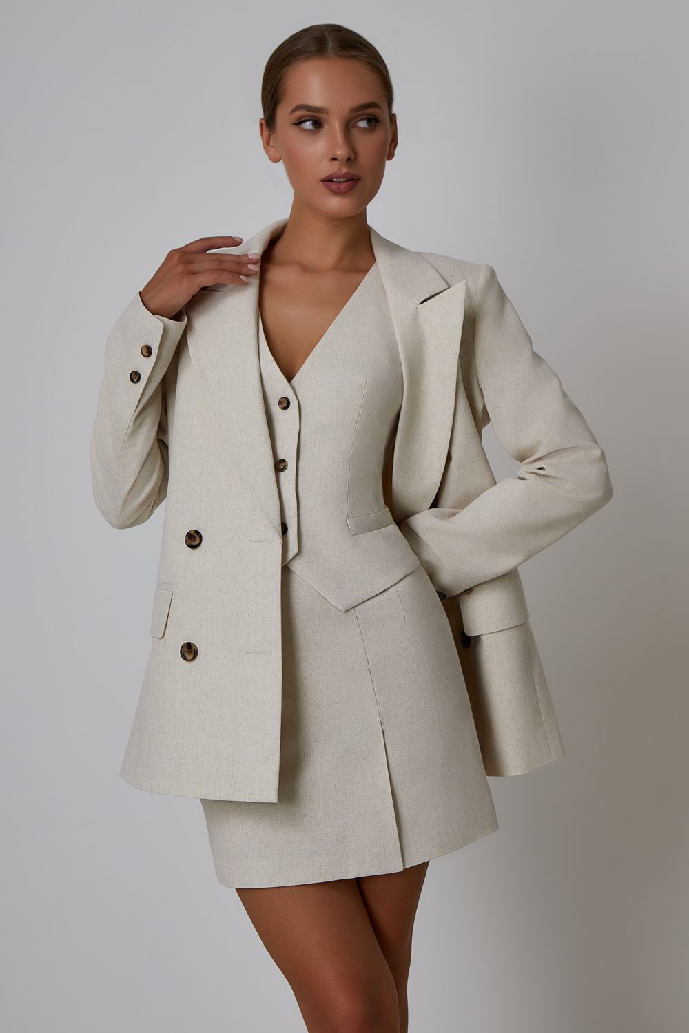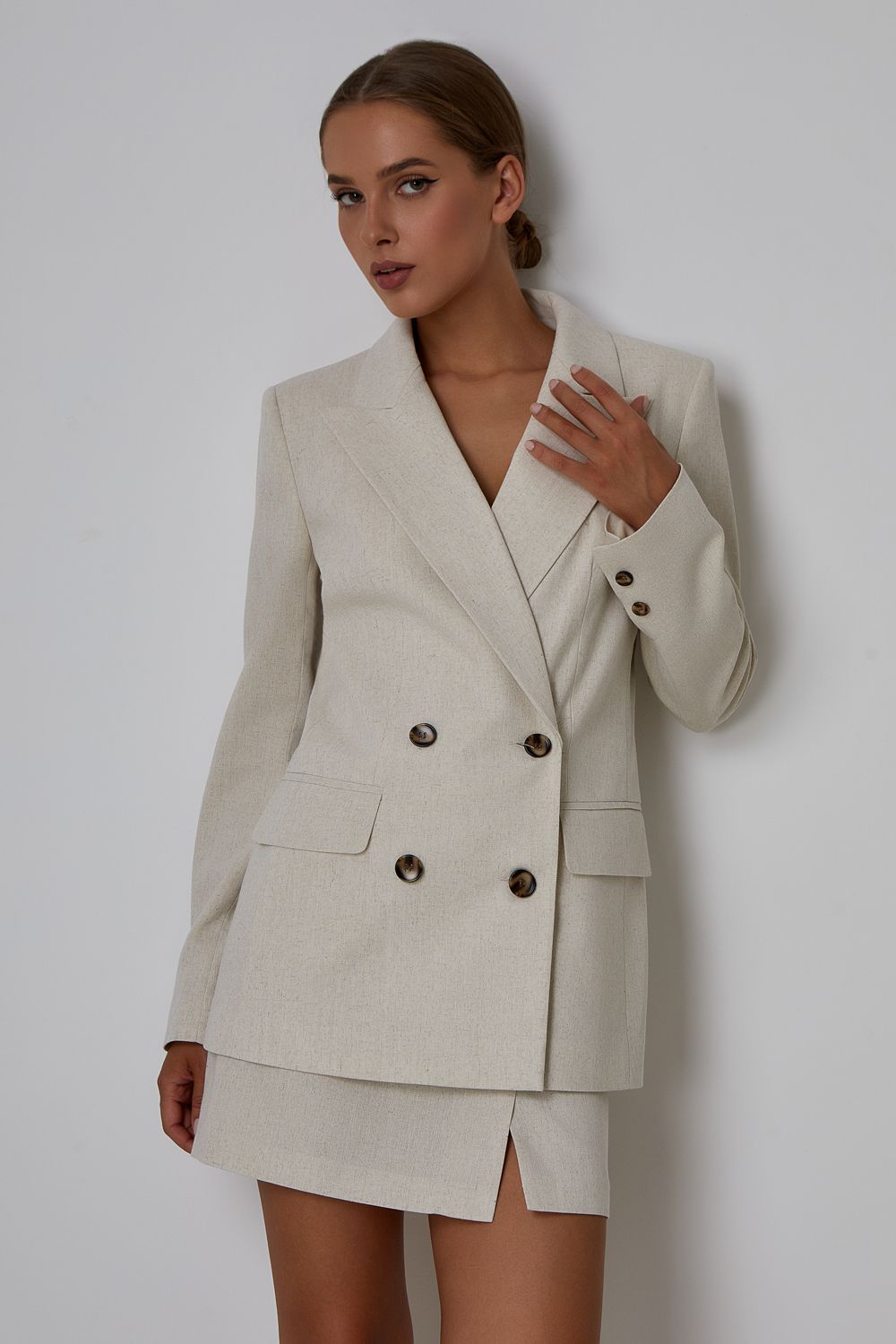 Мини-юбка из смесового льна. Изделие с высокой посадкой, застегивается потайной молнией сзади. Длина 43 см. К юбке идеально подойдут жакет (арт. 51342) и жилет (арт. 50901) из коллекции LN Family. Состав: 35% вискоза, 35% лен, 30% полиэстер. Подкладка: 95% полиэстер,5% эластан.