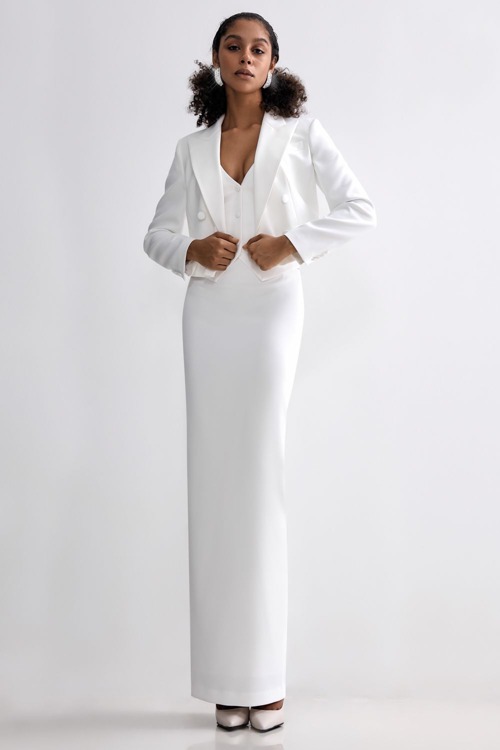 Элегантная прямая юбка длины макси из плотной костюмной ткани с мягким матовым блеском. Посадка на талии подчёркивает силуэт, визуально вытягивая фигуру и создавая утончённую вертикаль. Плавная линия кроя без лишних деталей формирует чистый, лаконичный образ. 71% полиэстер, 23% вискоза, 6% эластан, Подклад 97% полиэстер 3% эластан