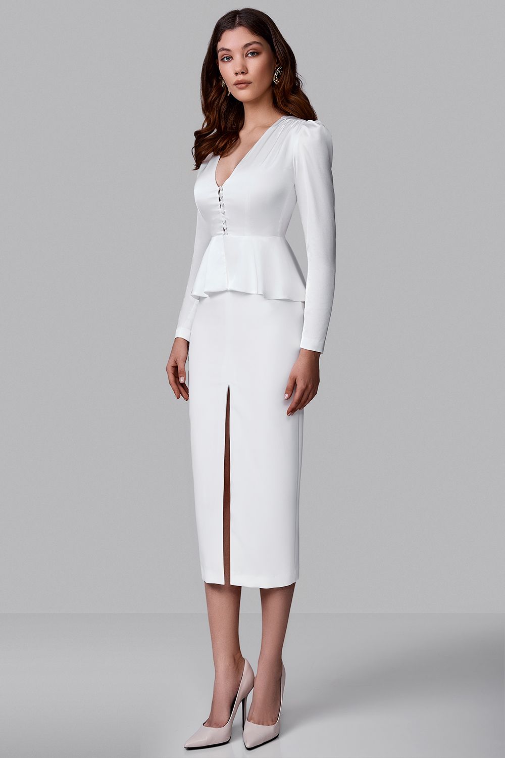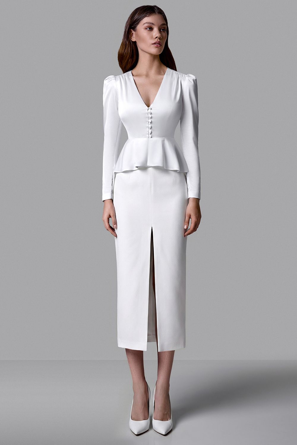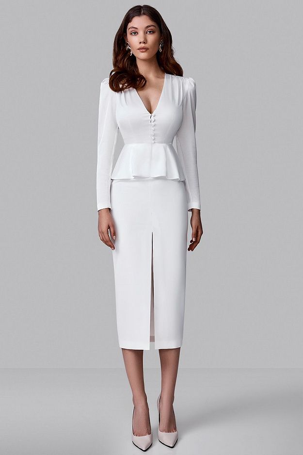 Юбка-карандаш миди — основа современного гардероба, в которой минимализм встречается с точной посадкой. Облегающий силуэт подчеркивает фигуру, а высокий разрез спереди добавляет динамику и визуально вытягивает силуэт. Модель легко интегрируется как в деловые, так и в вечерние образы, сохраняя баланс между строгостью и женственностью. Идеальна в сочетании с жакетами, корсетами и трикотажем. Универсальная юбка миди, которая адаптируется под любой стиль и сезон. Состав: 71% полиэстер, 23% вискоза, 6% эластан, Подклад 95% полиэстер 5% эластан
