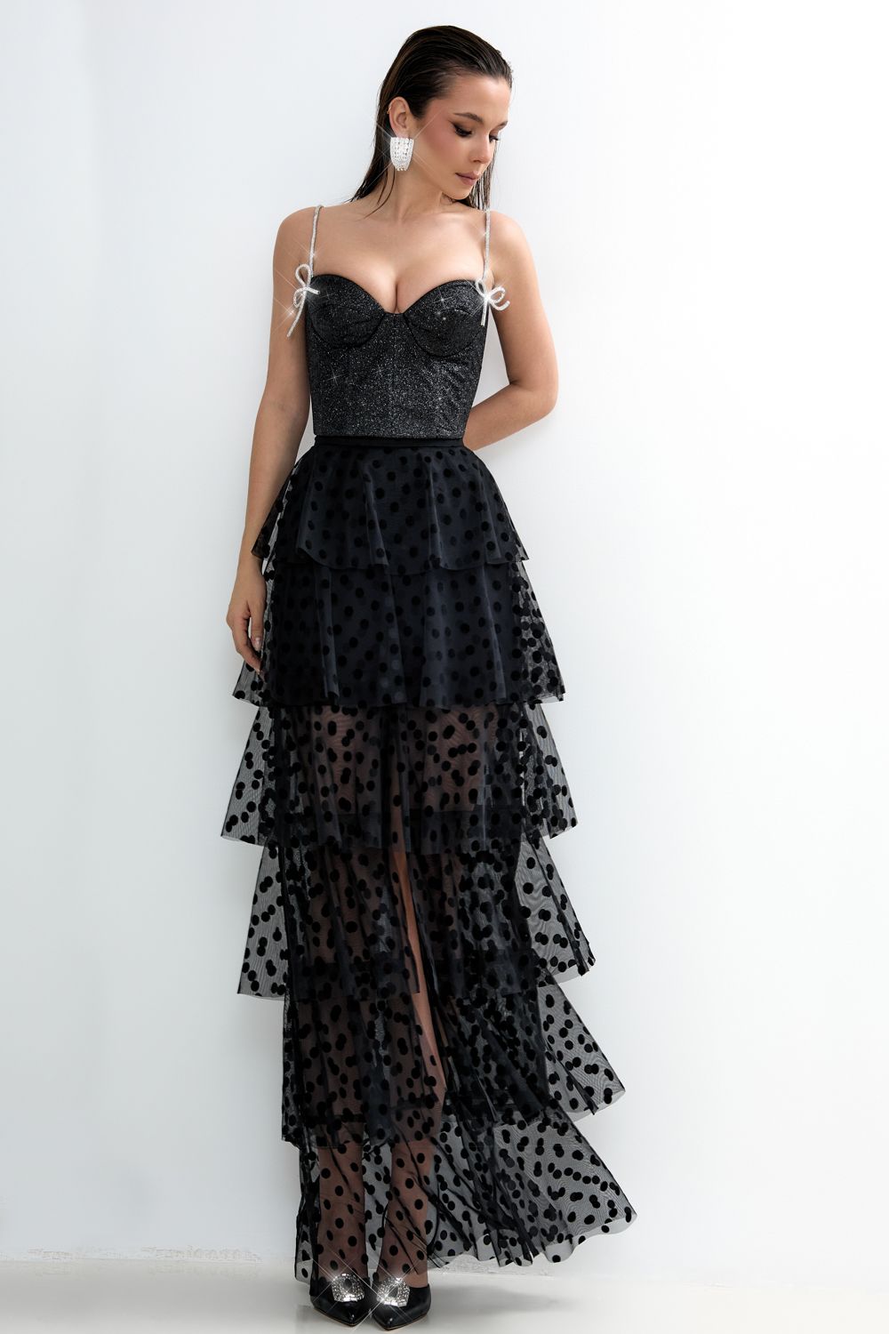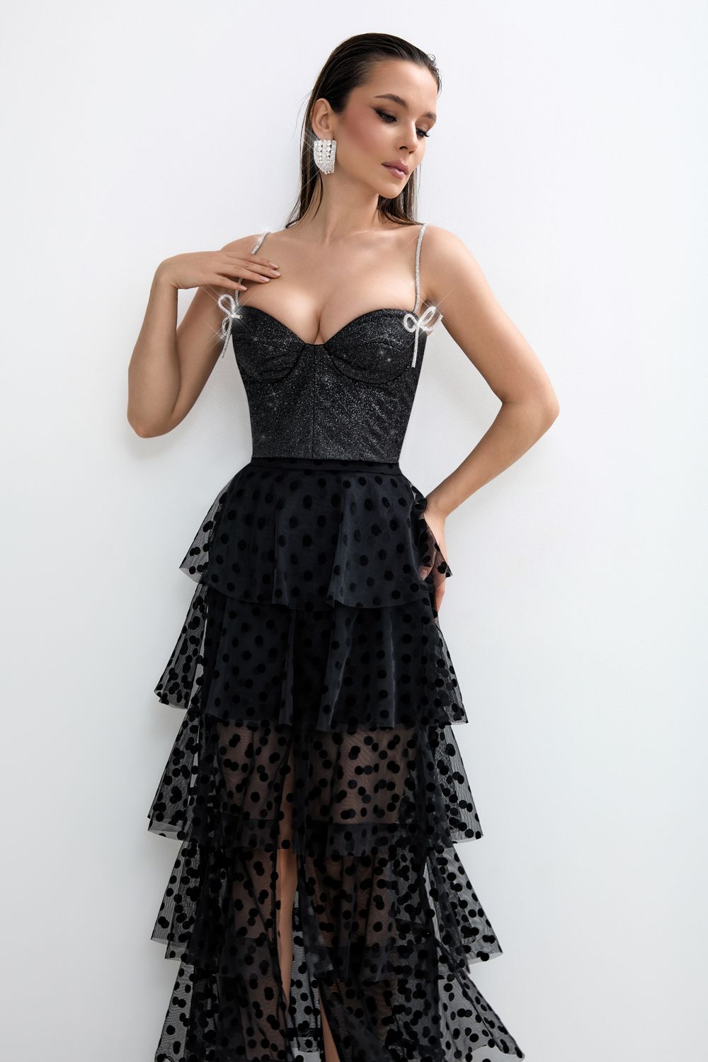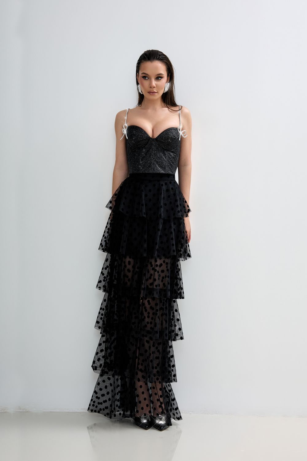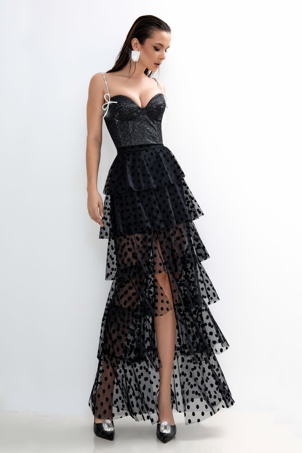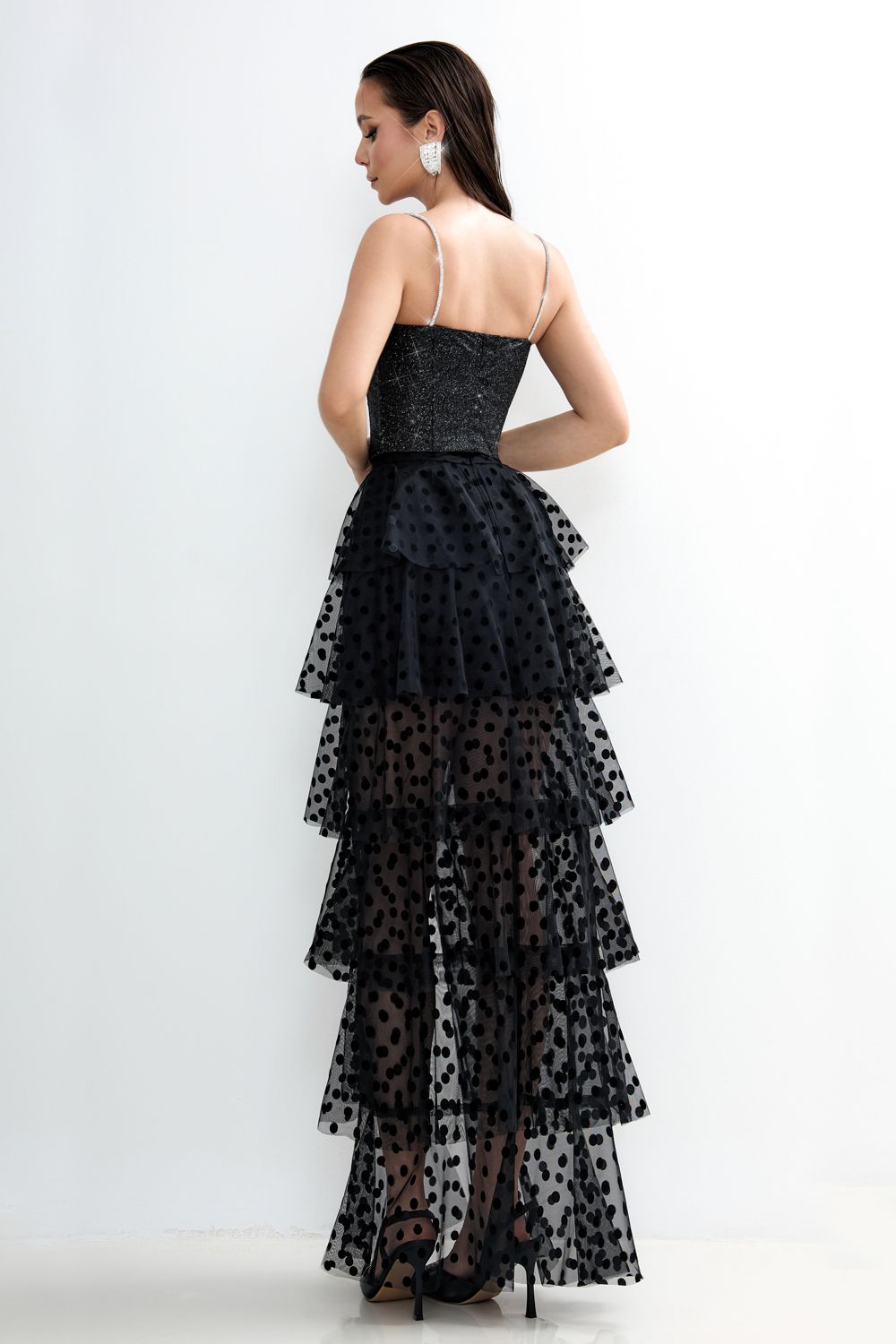 Потрясающая юбка из невесомой прозрачной ткани с высоким разрезом спереди, кокетливо открывающим ноги при движении. Ткань с нанесением глиттера. Незначительное осыпание в процессе эксплуатации (особенно в первые несколько использований или при интенсивном трении/контакте) является неизбежной особенностью данного вида декора. Длина юбки: 108 см. Состав: 100% полиэстер. Подкладка: 97% полиэстер, 3% эластан.