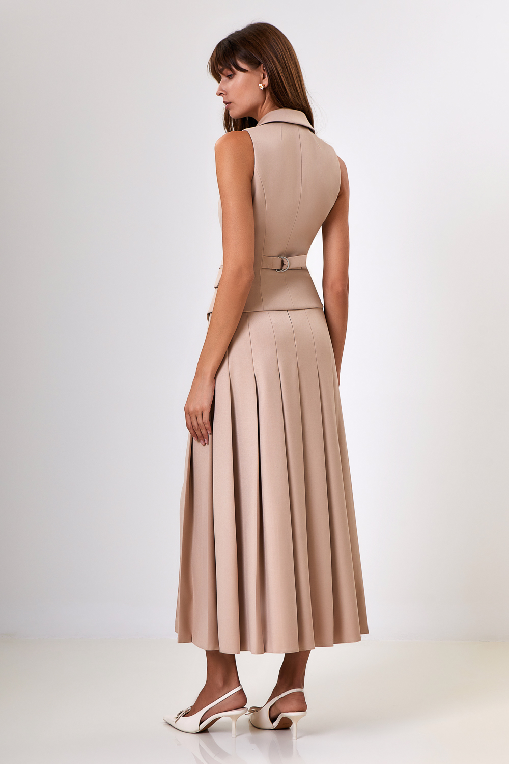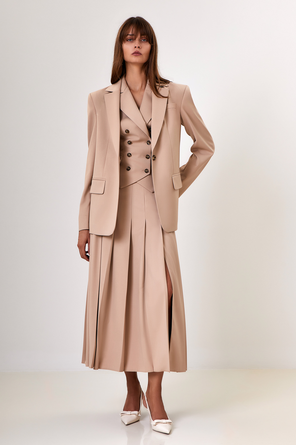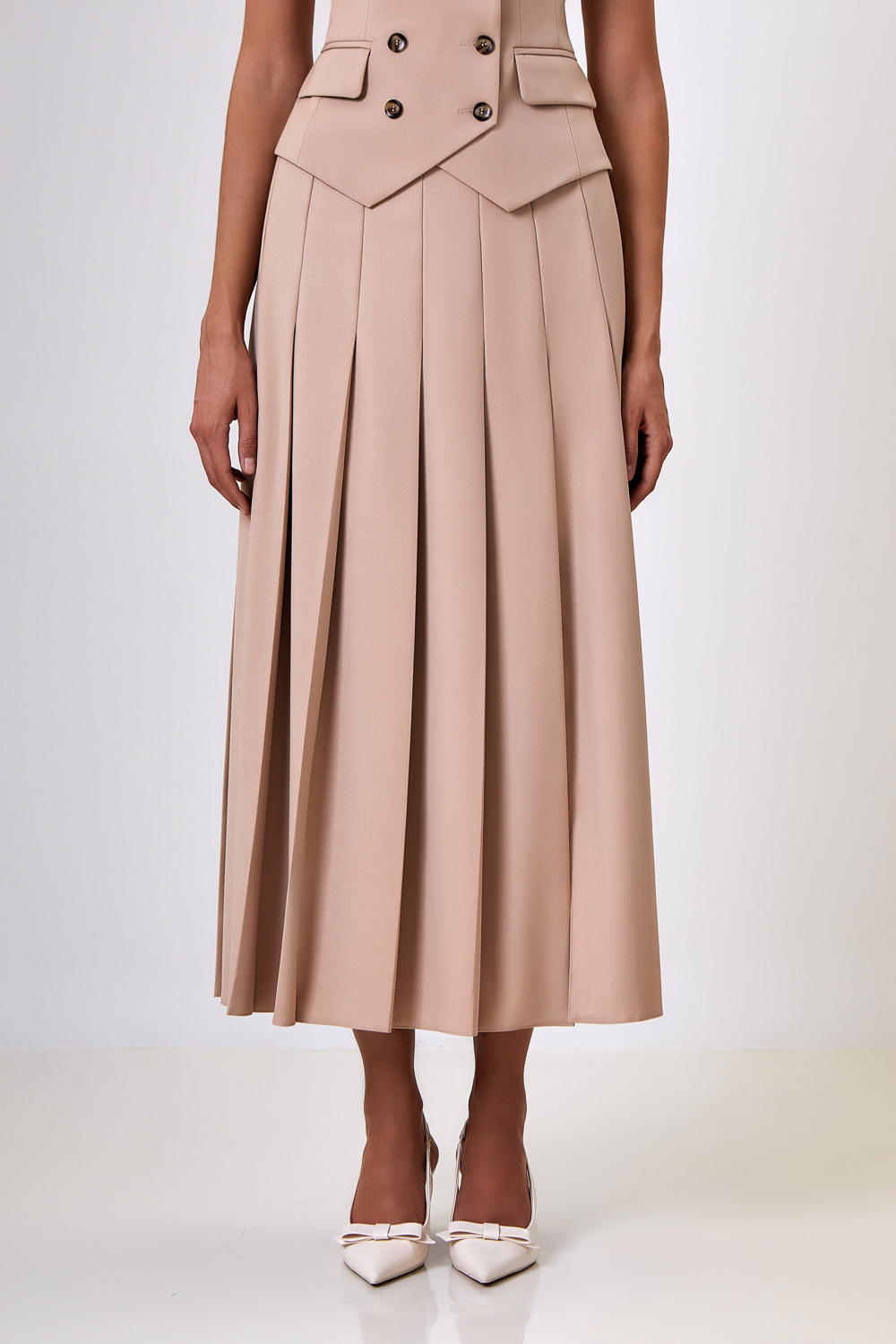 Плиссированная юбка длины миди с завышенной талией и разрезом на бедре. Длина 88 см. К юбке идеально подойдут жакет (арт. 56842) и жилет (арт. 57085) из коллекции LN Family. Состав: 56% полиэстер, 30 %вискоза, 14% сорона. Подкладка: 95% полиэстер, 5% эластан.