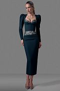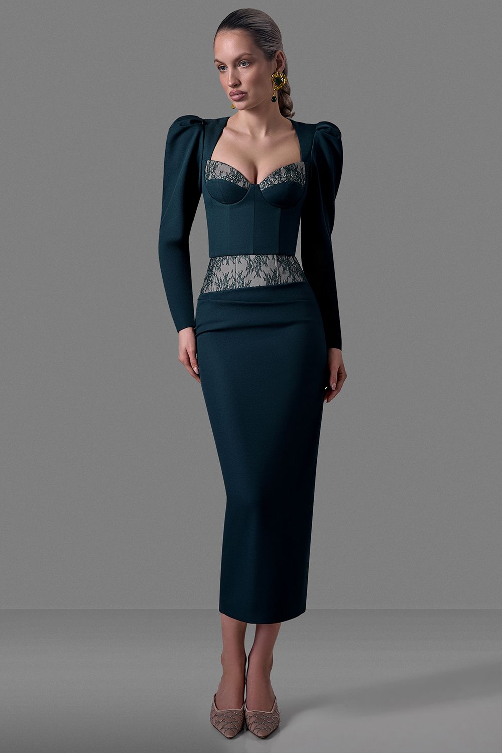 Элегантная юбка-карандаш миди, выполненная из плотного костюмного материала, формирует безупречный силуэт и подчёркивает линию бёдер. Главный акцент - широкая прозрачная вставка из деликатного кружева по линии талии, создающая эффект визуального «песочных часов» и гармонирующая с корсетной частью комплекта. Состав: 95% полиэстер, 5% спандекс, Подкладка 97% полиэстер, 3% спандекс