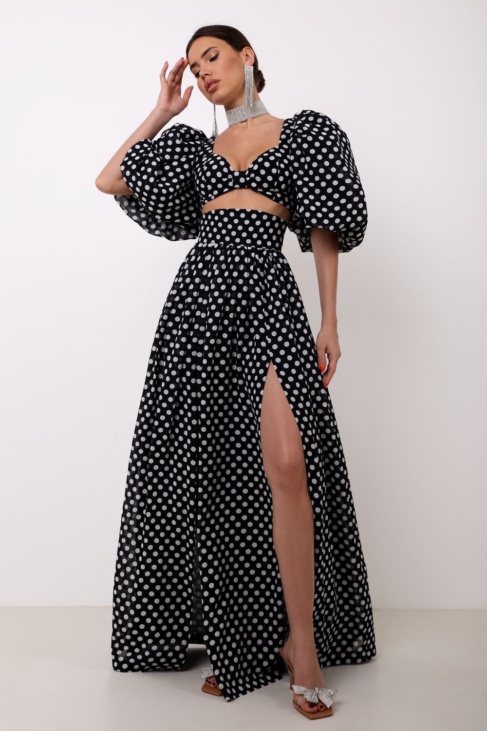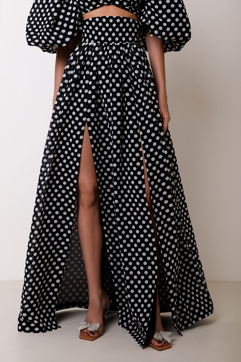 Расклешенная миди-юбка с двумя вырезами спереди, высокой посадкой на талии и широким поясом создает отчетливый силуэт. Длина 119 см. К юбке идеально подойдет Топ артикул: 23479. Состав: 100% Полиэстер; Подкладка 100% Полиэстер