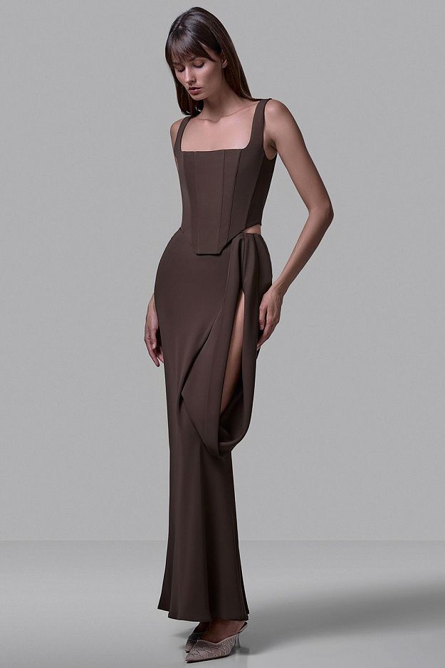 Юбка выполнена в длине макси и имеет изысканный минималистичный крой.Особый акцент сделан на высоком разрезе сбоку, дополненном мягкой драпировкой, которая образует элегантную складку и добавляет объема. Посадка высокая, что визуально вытягивает силуэт и гармонично сочетается с корсетным верхом. Состав: 72% полиэстер, 15% нейлон, 10% вискоза, 3% эластан;подкладка:95% полиэстер,5% эластан