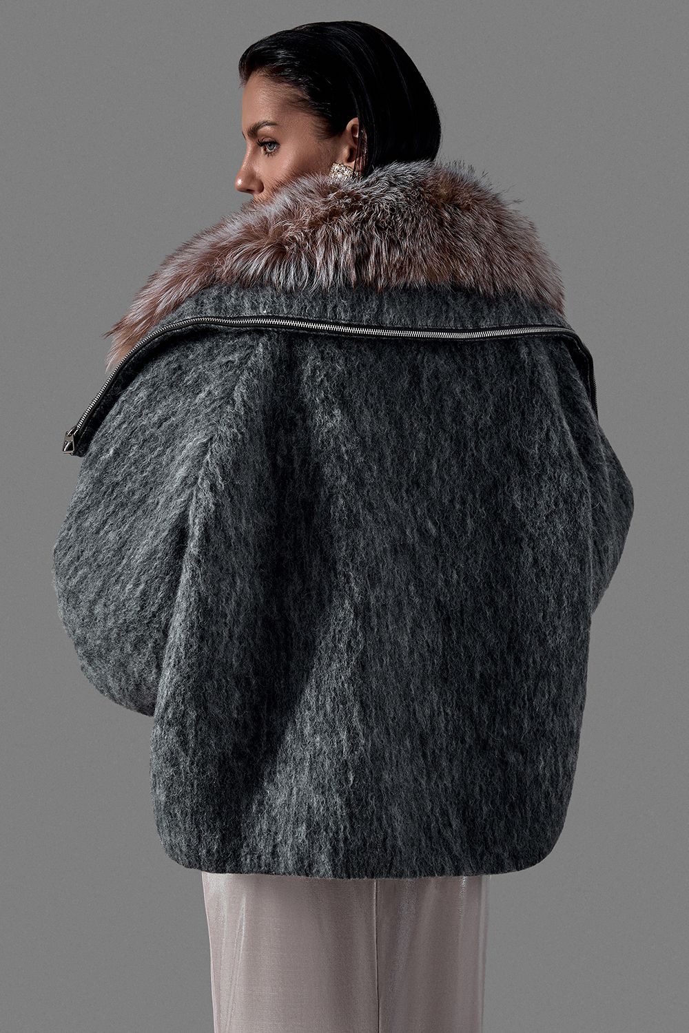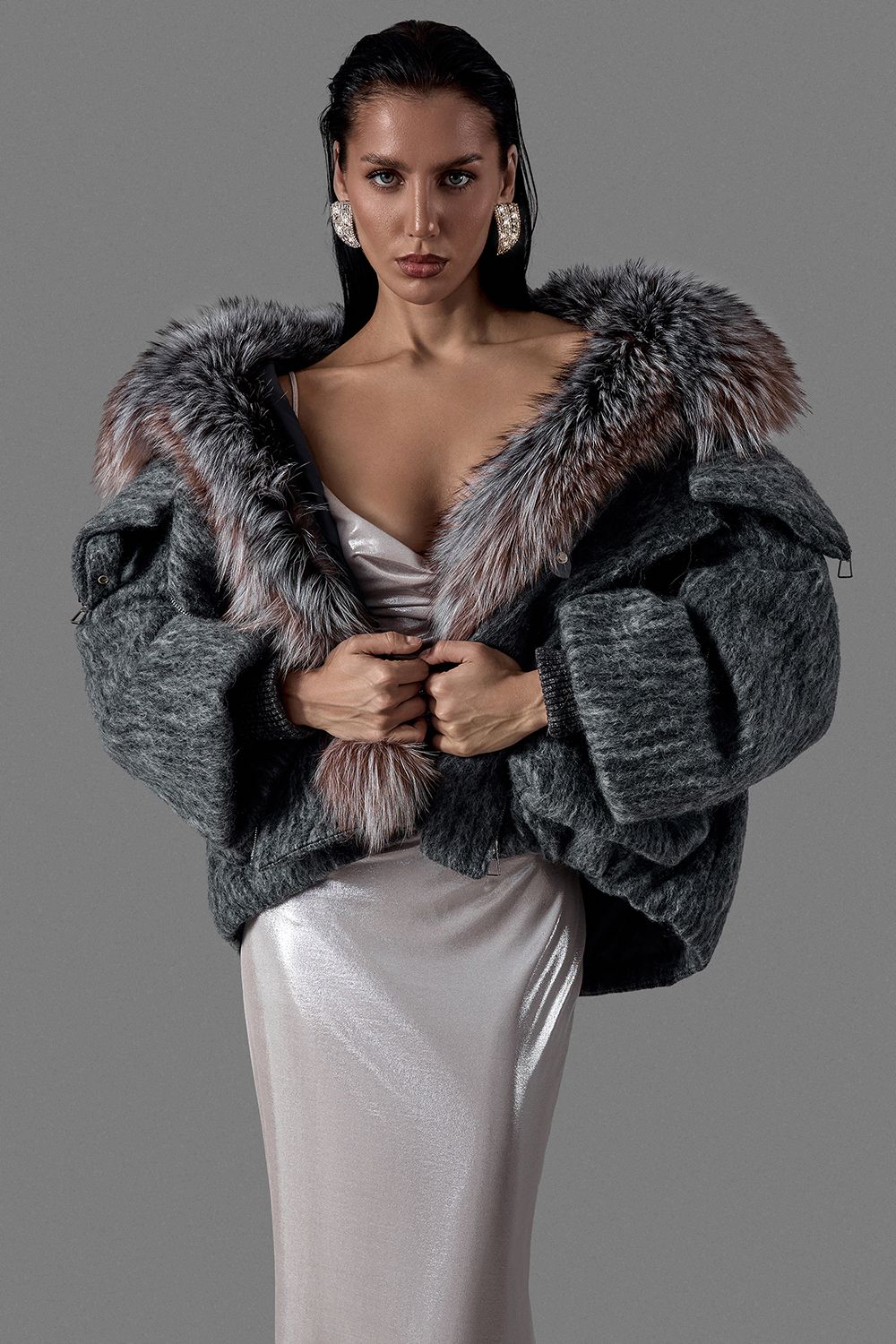 Акцентный бомбер свободного кроя выполнен из плотной фактурной ткани. Широкий воротник и борт дополнены контрастной отделкой из натурального меха, которая придаёт образу выразительность и визуальную глубину. Застежка на молнию добавляет функциональности.Состав: Верх: 90% полиэстер,10% натуральный шелк; подкладка: 100% нейлон; наполнитель: 90% гусиный пух