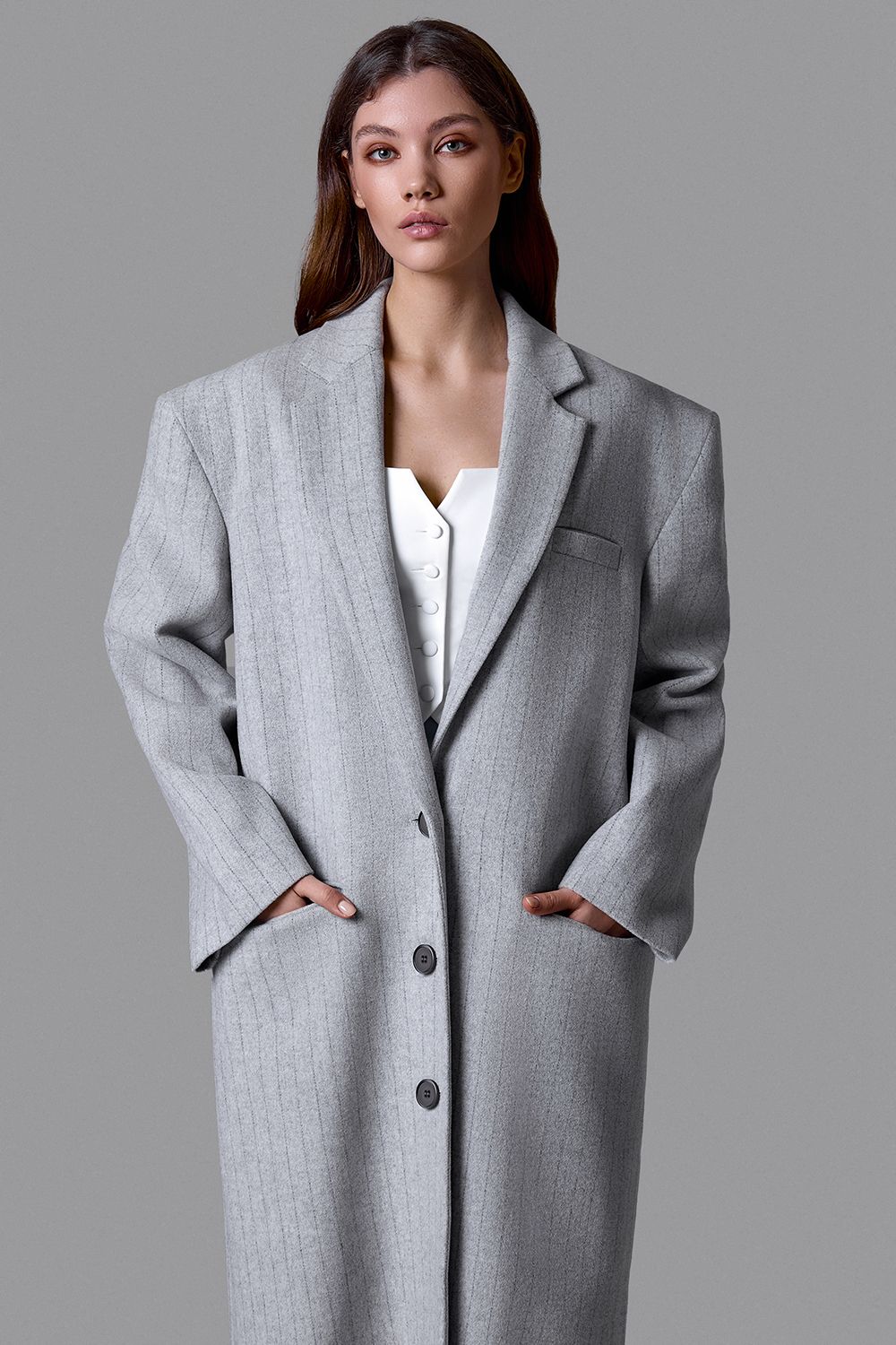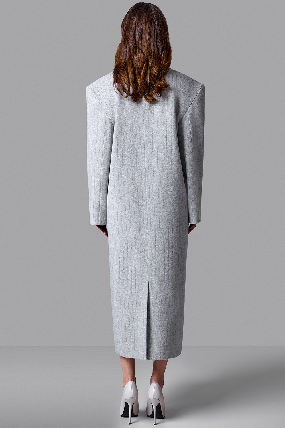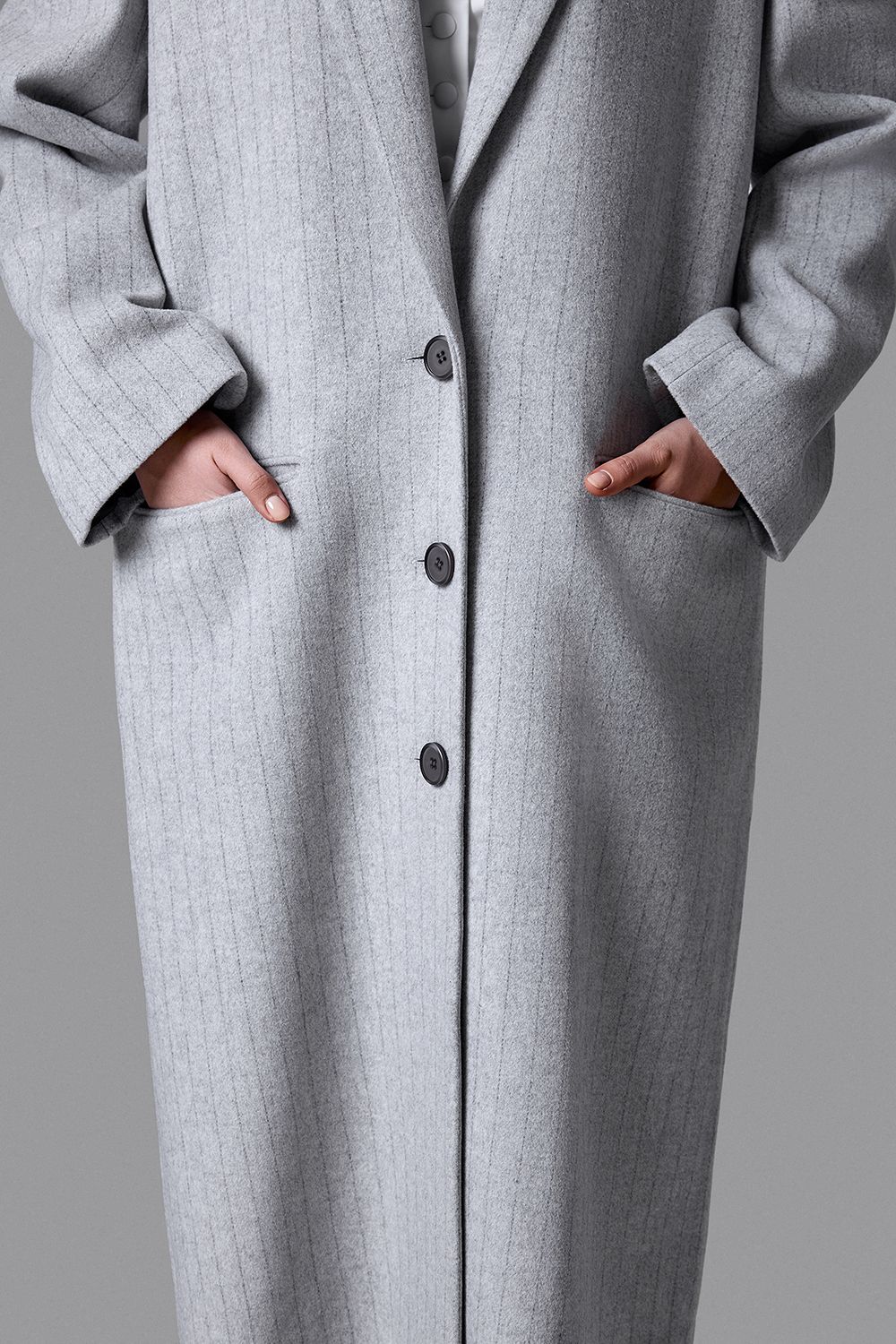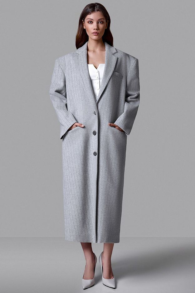 Серое пальто в тонкую вертикальную полоску - выверенный баланс классики и современного кроя. Прямой удлиненный силуэт, четкая линия плеча и лаконичная застежка на пуговицы формируют строгий, архитектурный образ. Плотная ткань мягко держит форму и подчеркивает статус. Универсальная модель для делового гардероба и повседневной элегантности. Состав: 100% шерсть