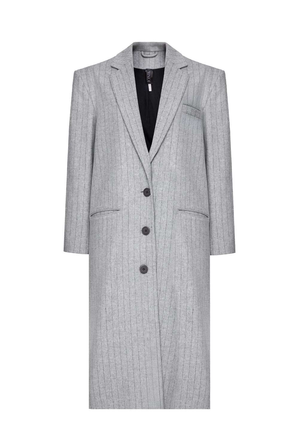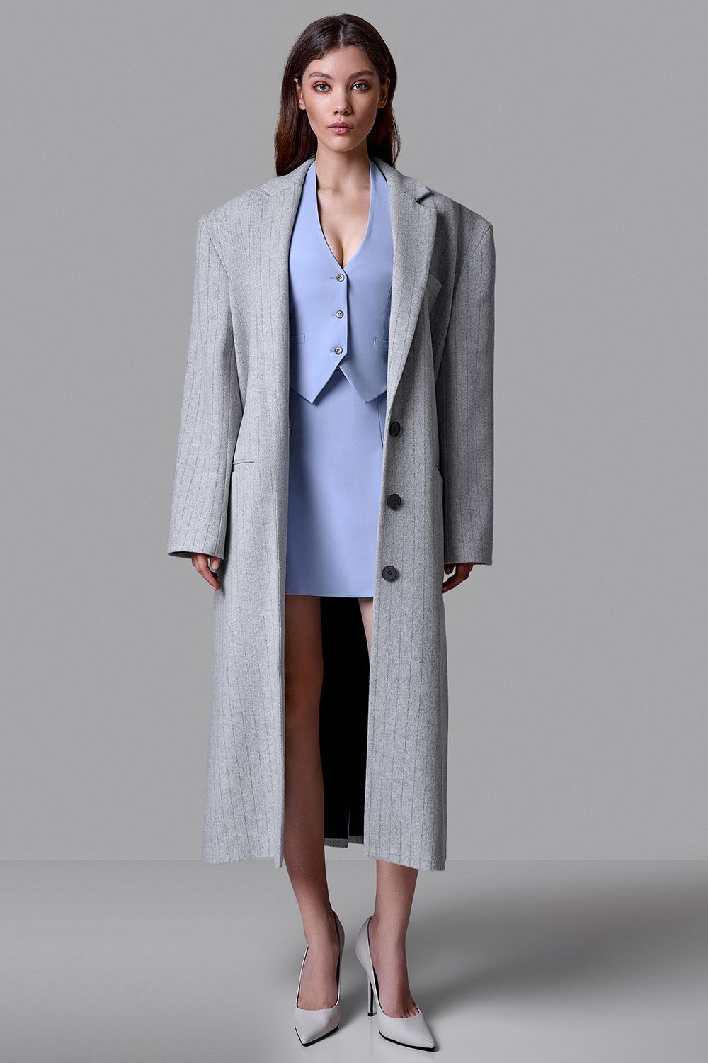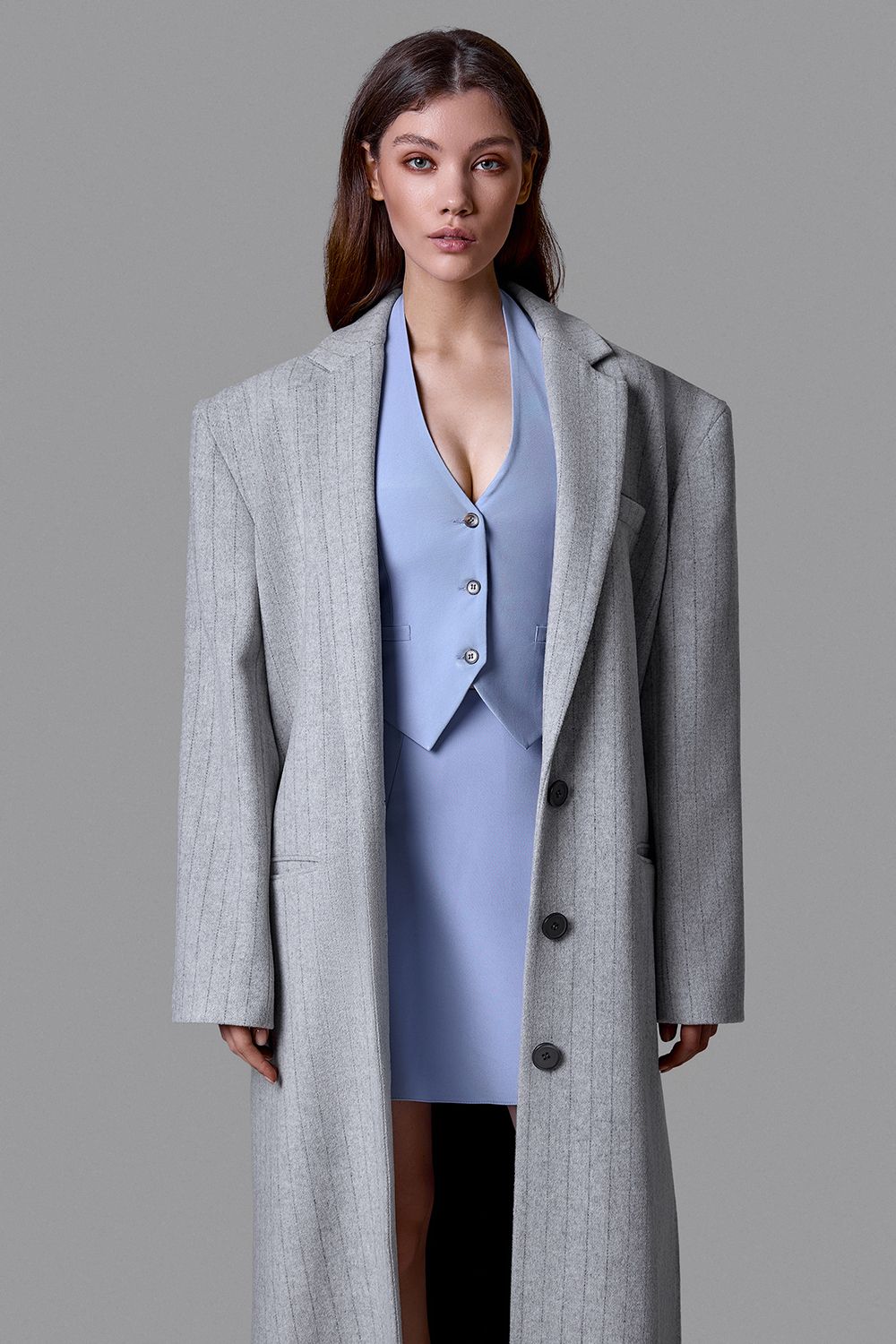 Серое пальто в тонкую вертикальную полоску - выверенный баланс классики и современного кроя. Прямой удлиненный силуэт, четкая линия плеча и лаконичная застежка на пуговицы формируют строгий, архитектурный образ. Плотная ткань мягко держит форму и подчеркивает статус. Универсальная модель для делового гардероба и повседневной элегантности. Состав: 100% шерсть