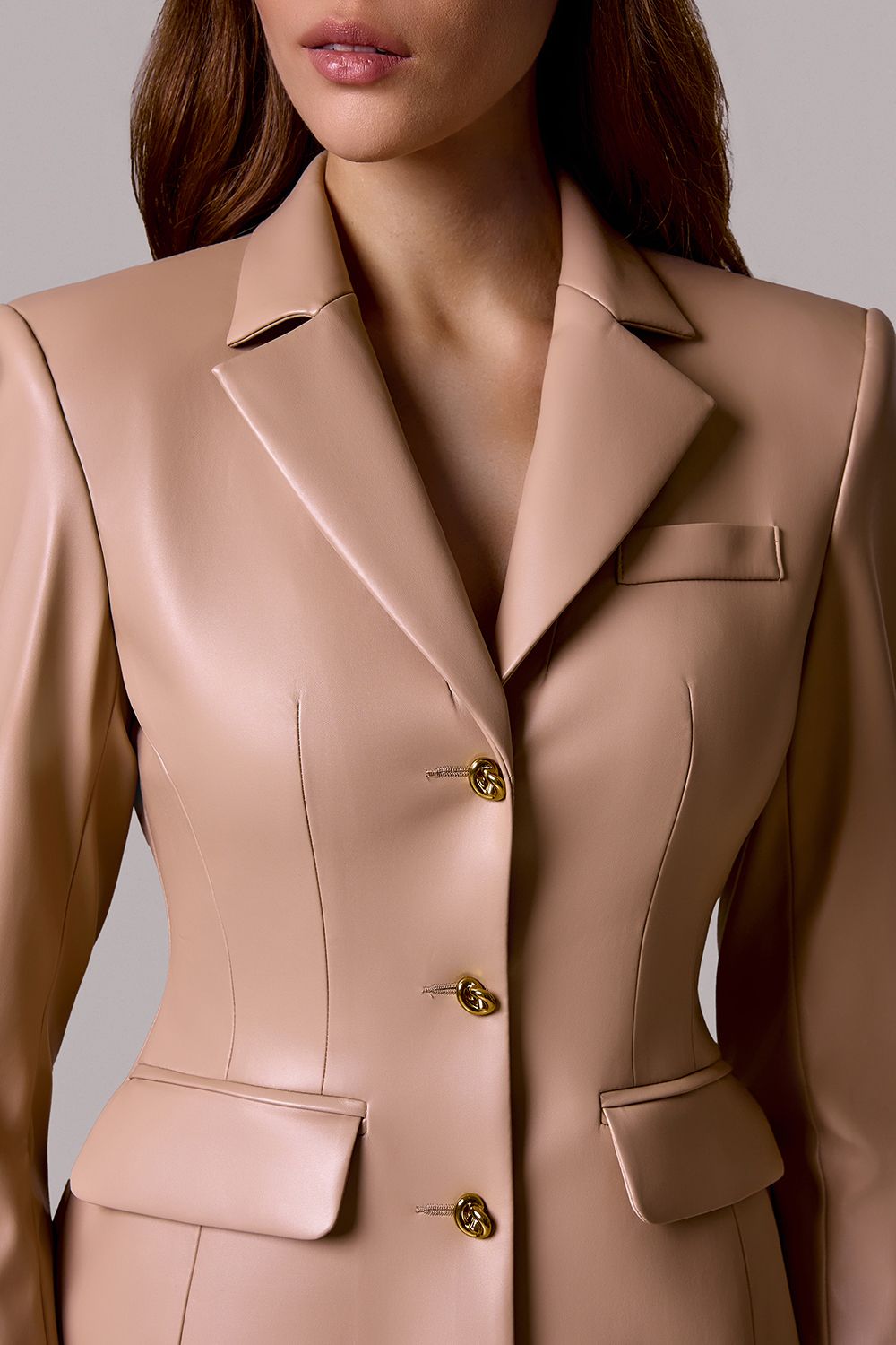 Приталенный жакет из экокожи — выразительный элемент гардероба с архитектурным силуэтом. Чёткая линия плеч и зауженная талия формируют графичную посадку, подчеркивая фигуру. Гладкая фактура материала добавляет образу глубину и современный характер. Острые лацканы и лаконичная застёжка усиливают строгость и элегантность модели. Идеален в комплекте с юбкой или брюками, создавая цельный и эффектный образ. Состав: 100% полиэстер, подкладка 95% полиэстер, 5% эластан