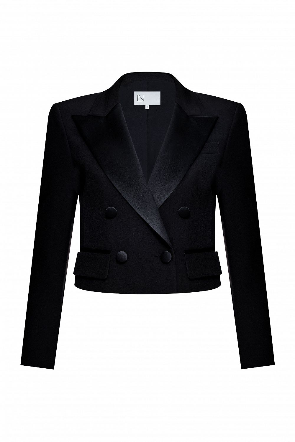 Укороченный жакет из плотного костюмного материала с матовым блеском. Модель с акцентными широкими лацканами и чёткой линией плеч. Двубортная застёжка на обтянутые пуговицы придаёт изделию утончённую завершённость. Лаконичные клапаны карманов и аккуратный декоративный кантик вдоль борта добавляют образу архитектурности. Состав: 71% полиэстер, 23% вискоза, 6% эластан, Подклад 97% полиэстер 3% эластан