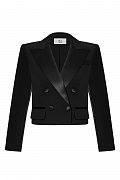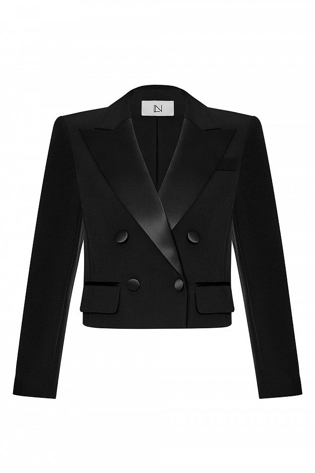 Укороченный жакет из плотного костюмного материала с матовым блеском. Модель с акцентными широкими лацканами и чёткой линией плеч. Двубортная застёжка на обтянутые пуговицы придаёт изделию утончённую завершённость. Лаконичные клапаны карманов и аккуратный декоративный кантик вдоль борта добавляют образу архитектурности. Состав: 71% полиэстер, 23% вискоза, 6% эластан, Подклад 97% полиэстер 3% эластан