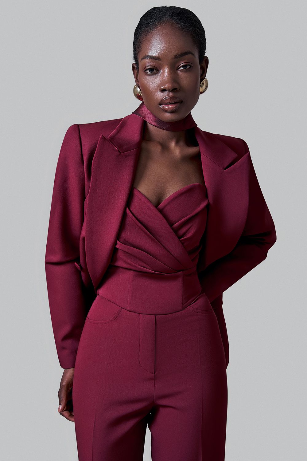 Элегантный жакет, выполнен из плотной костюмной ткани премиального качества. Модель отличается двубортной застёжкой с обтянутыми пуговицами в тон и выразительными плечами, создающими чёткий силуэт. Прямой крой, острые лацканы и прорезные клапанные карманы придают образу современную строгость и утончённость. Идеально сочетается как с классическими брюками, так и с юбками. Состав: 97% полиэстер, 3% спандекс, подкладка 95% полиэстер, 5% эластан