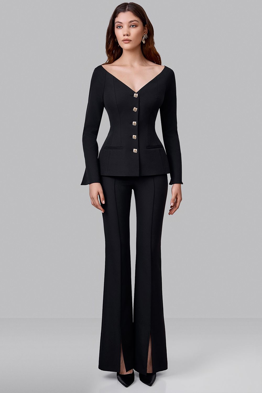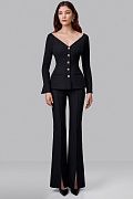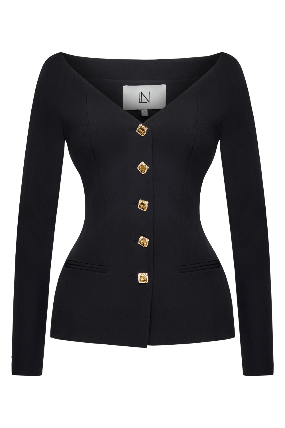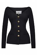 Жакет приталенного силуэта с акцентом на открытую линию плеч. Раскрытая зона декольте подчёркивает шею и ключицы. Декоративные металлические пуговицы добавляют выразительный акцент. Состав: 72% полиэстер, 23% вискоза, 5% эластан, Подклад 95% полиэстер, 5% эластан